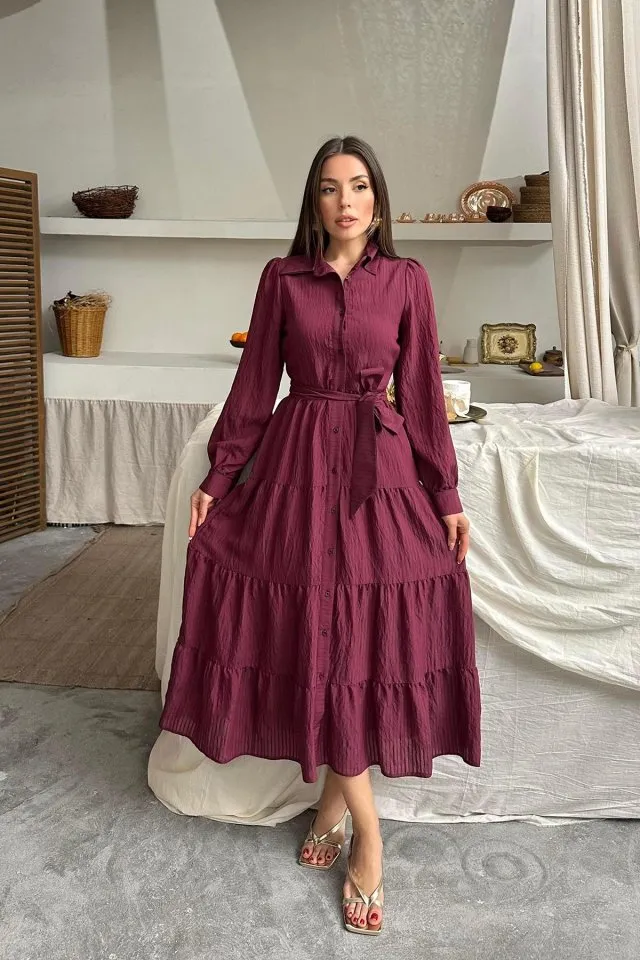 فستان نسائي ميدي منقط بياقة قميص ورباط خصر وأزرار أمامية