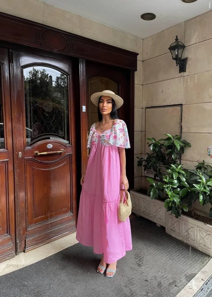فستان ميدي مطرز بتنورة بكسرات وياقة مربعة. انسيابي ومريح للمشاوير اليومية وخروجات نهاية الأسبوع.