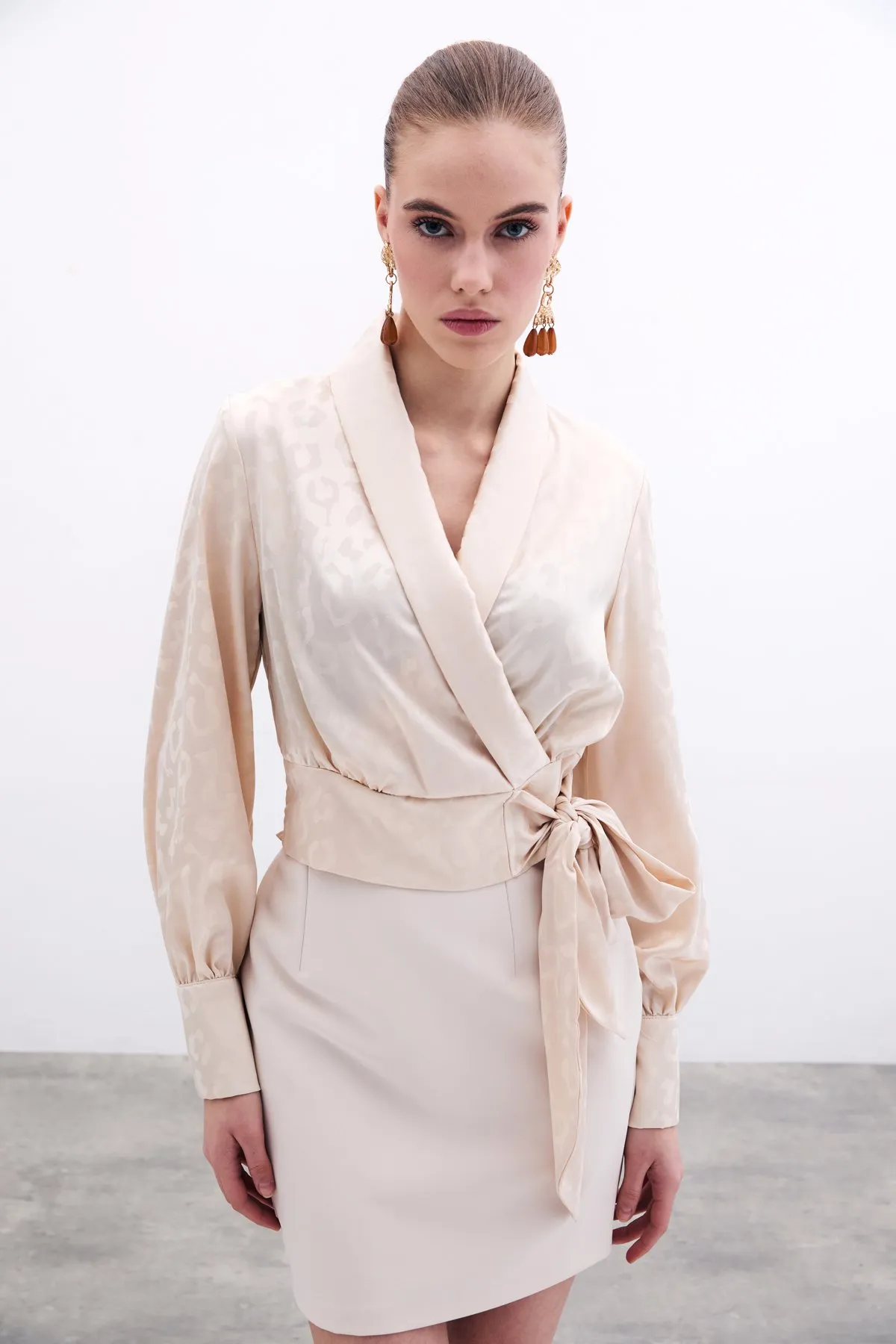 بلوزة محبوكة بياقة V وتفصيل مجمّع من الأمام مع أكمام قصيرة. مناسبة للتنسيقات الصيفية اليومية.