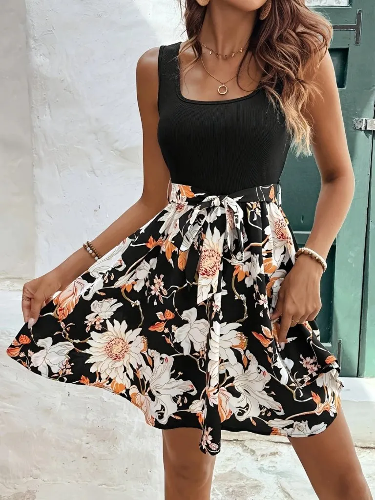 فستان ميني مجعد نسائي بياقة V وأكمام قصيرة مع كشكش. قصة كلوش بكسرات مثالية للإطلالات الصيفية الخفيفة.