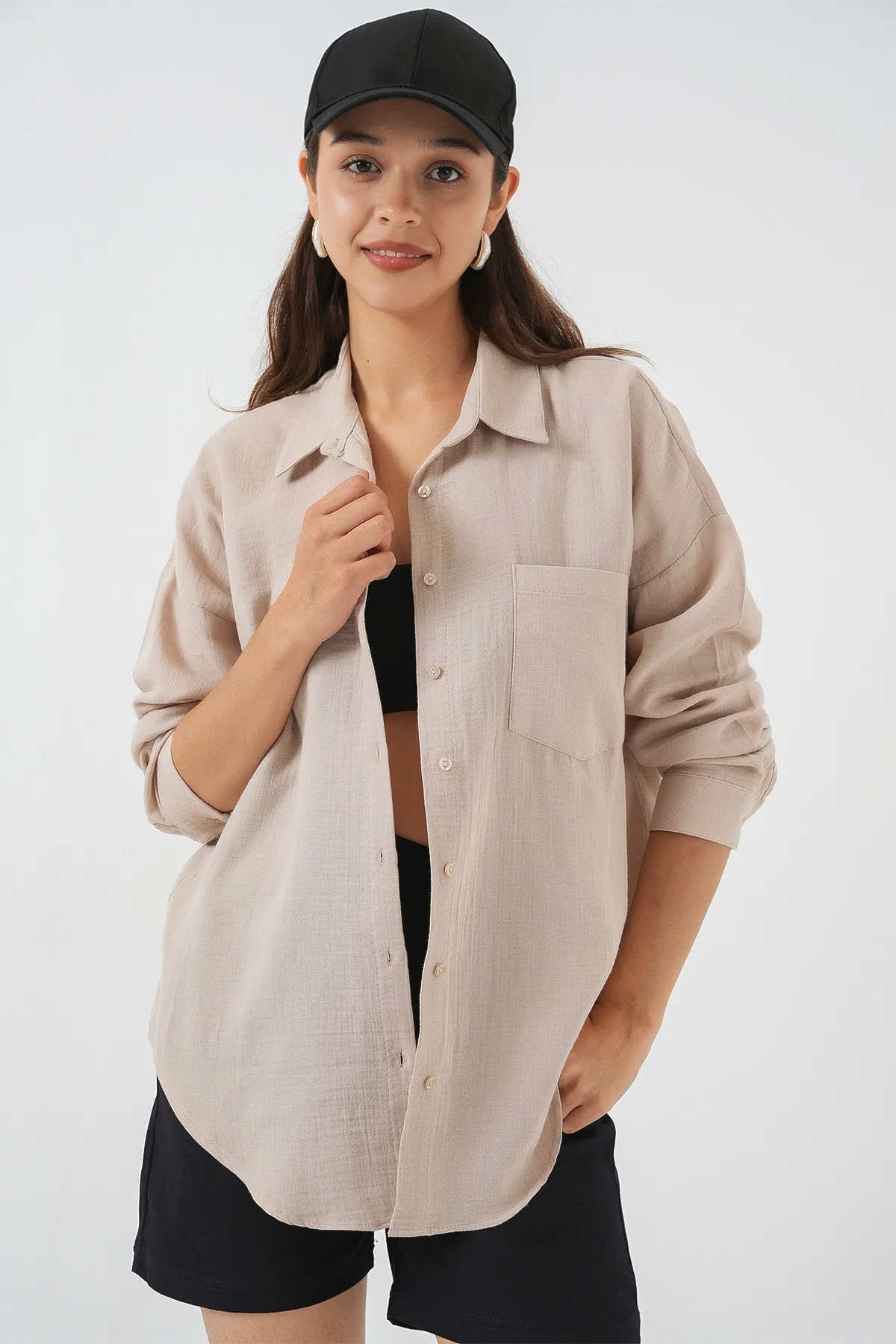 قميص مخطط بأكمام طويلة للنساء مع تفاصيل جيب واحد، مصنوع من قماش مريح مثالي لإطلالة يومية عملية وأنيقة.