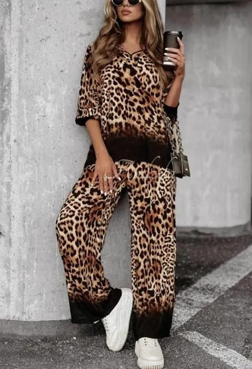 طقم نسائي من قطعتين ببلوزة بأكمام قصيرة وياقة غير متماثلة بتصميم مطبوع لامع.