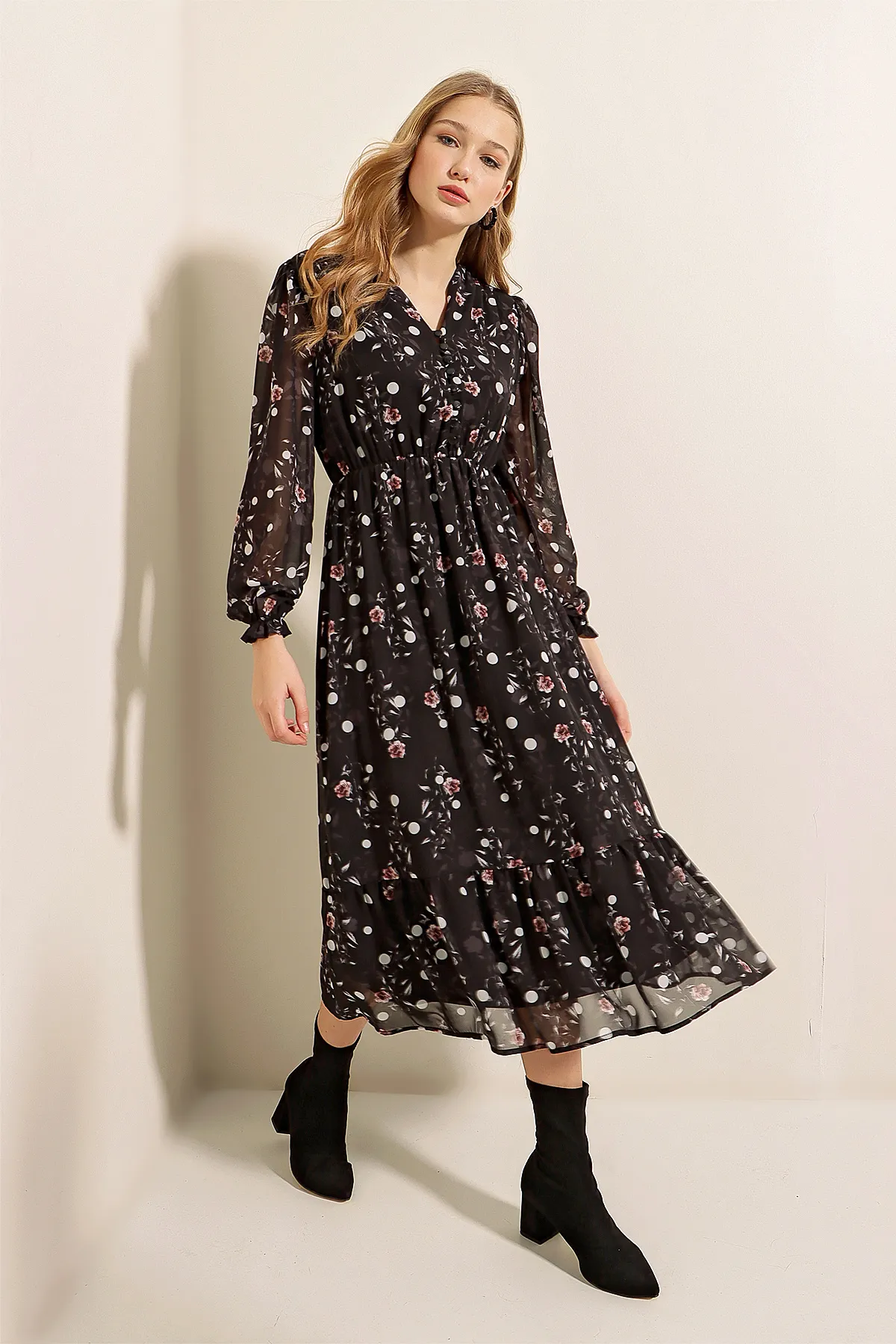 فستان ميدي واسع بأكمام قصيرة وياقة دائرية مع فتحة جانبية لإطلالة صيفية مريحة للنساء