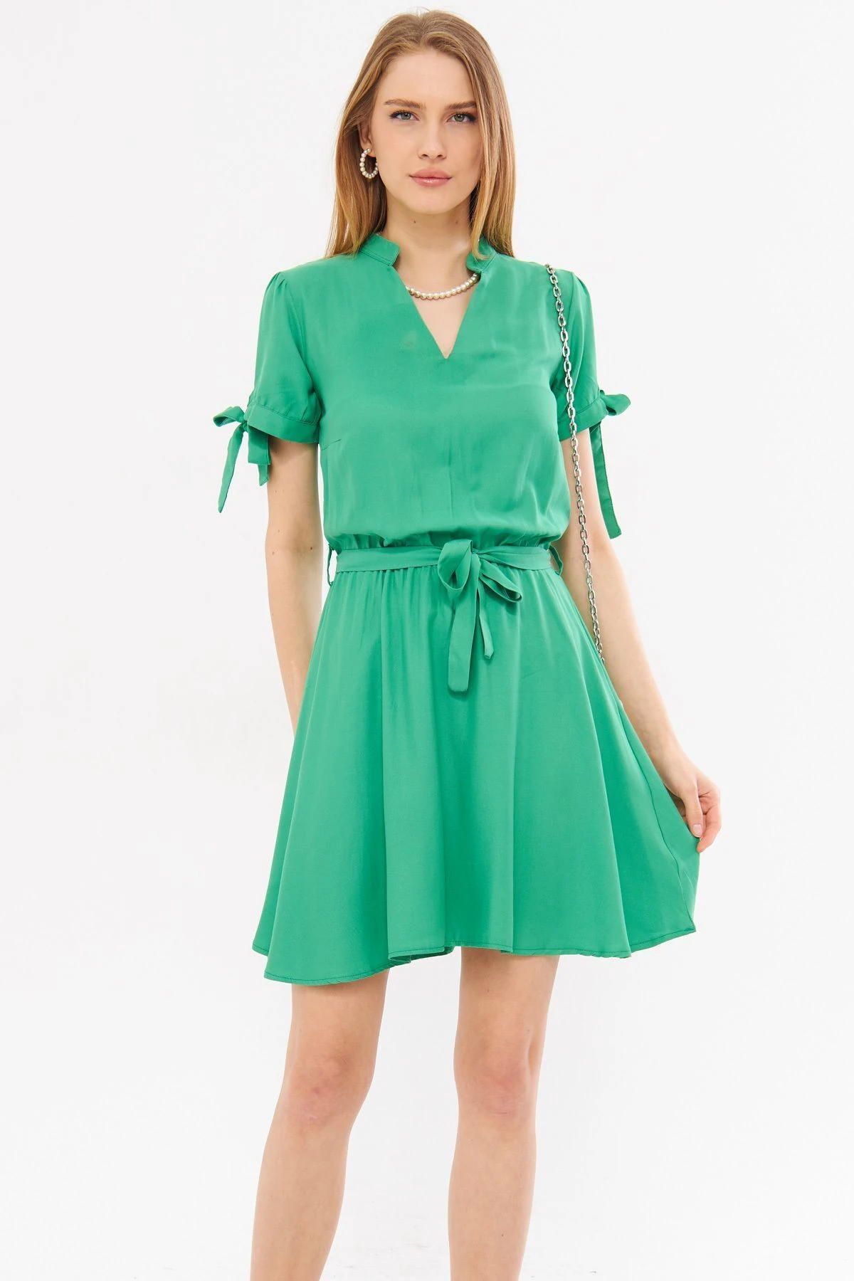 فستان ميدي كلوش بياقة دائرية وتفصيل فيونكة مزينة باللؤلؤ مع أكمام بالون. إطلالة ناعمة تناسب الأناقة اليومية وأجواء الطقس الدافئ للنساء.