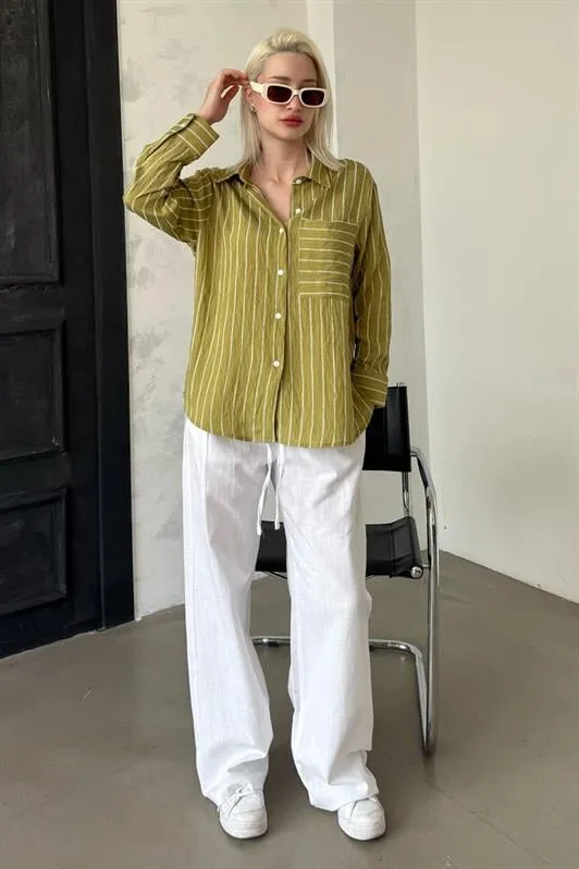 قميص مخطط بأكمام طويلة للنساء مع تفاصيل جيب واحد، مصنوع من قماش مريح مثالي لإطلالة يومية عملية وأنيقة.