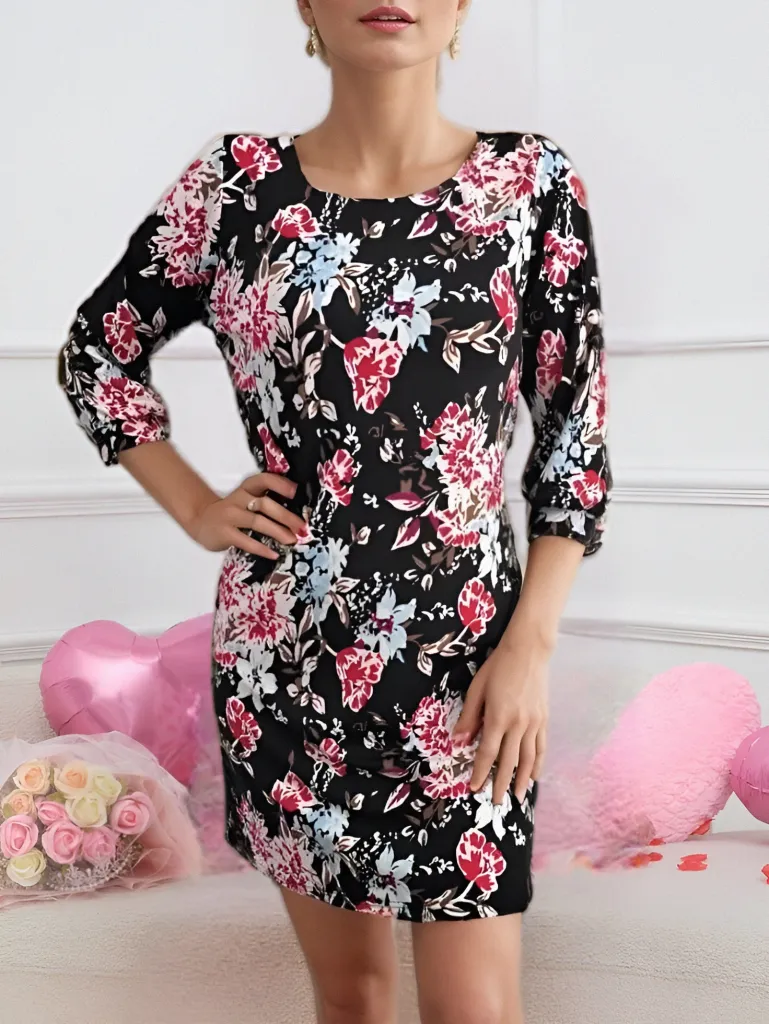 فستان ميدي كلوش بياقة دائرية وتفصيل فيونكة مزينة باللؤلؤ مع أكمام بالون. إطلالة ناعمة تناسب الأناقة اليومية وأجواء الطقس الدافئ للنساء.