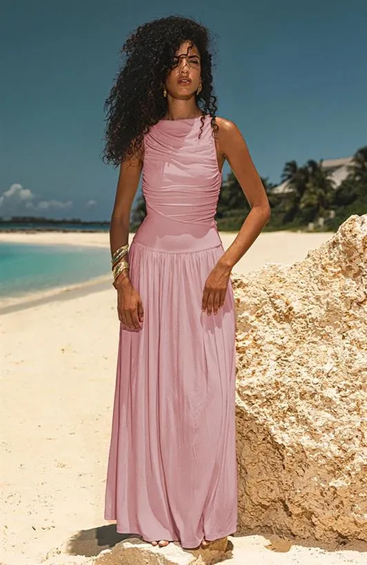 فستان نسائي بطيات وياقة مربعة مع حمالات رفيعة. تصميم أنيق يناسب الإطلالات اليومية والمسائية.