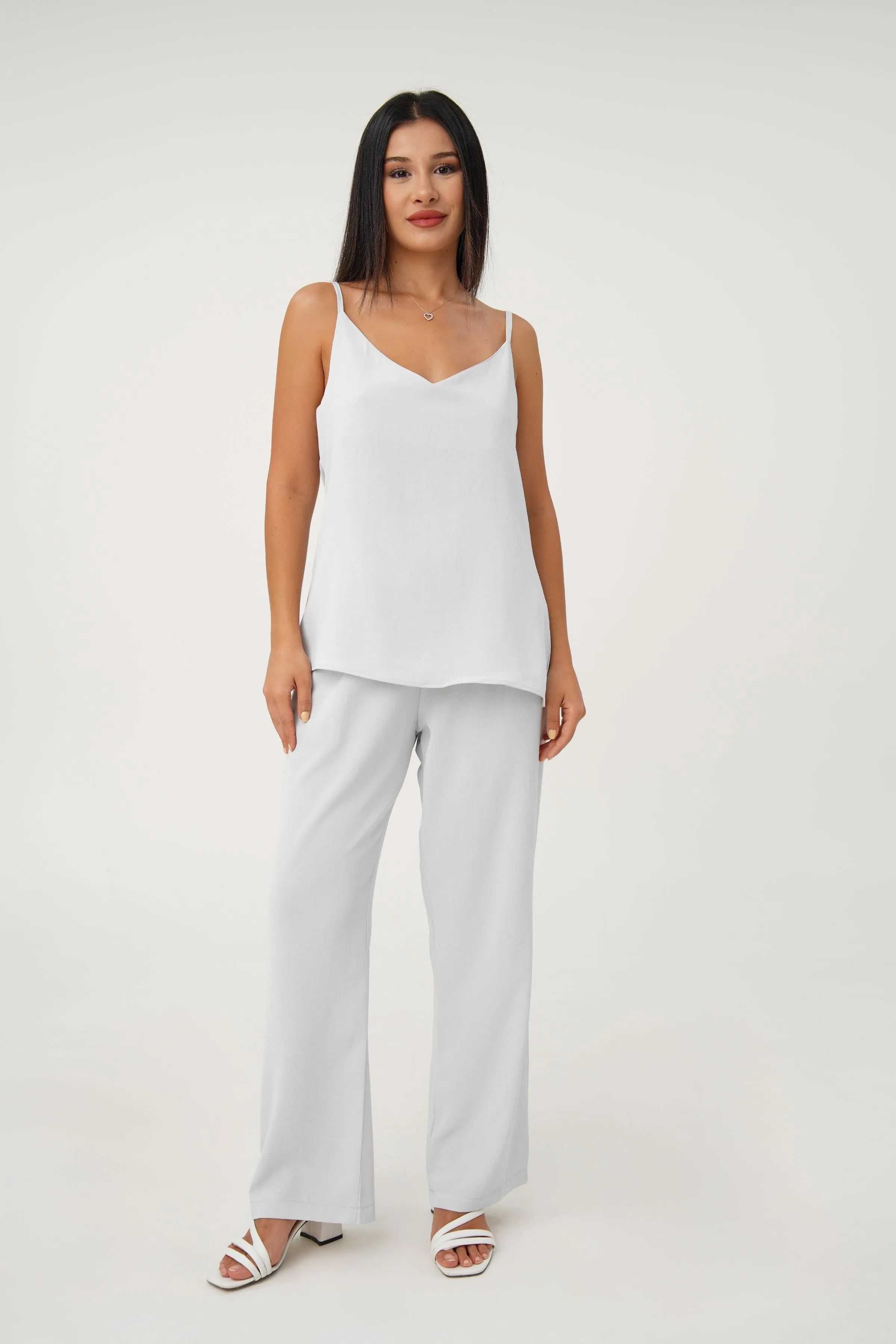 يتميز هذا الطقم النسائي بقميص منقوش بأزرار مع بنطلون واسع الساق، يجمع بين الأناقة الكلاسيكية والراحة الحديثة للارتداء المتنوع.
