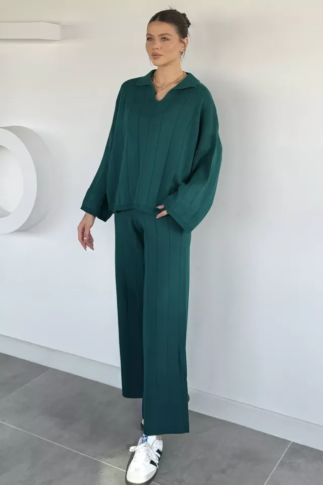 يتميز هذا الطقم النسائي بقميص منقوش بأزرار مع بنطلون واسع الساق، يجمع بين الأناقة الكلاسيكية والراحة الحديثة للارتداء المتنوع.