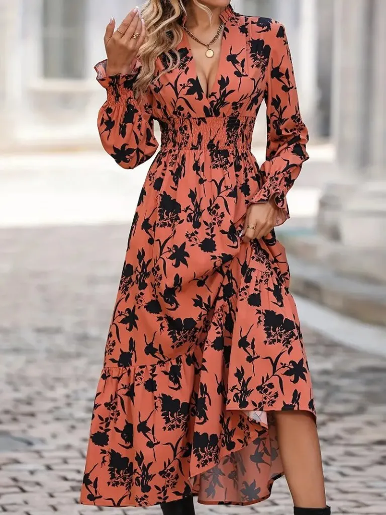 فستان ميدي منقوش بقصة A-Line بطبقات وأكتاف مكشوفة مع أكمام قصيرة لإطلالة يومية ناعمة