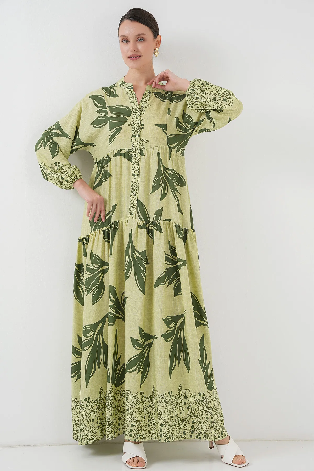 فستان ميدي كلوش بتصميم كتف مكشوف وأكمام بالون قصيرة مع حزام مجمع. يتميز بنقشة وتفصيل طبقات، مناسب للتنسيقات الصيفية الأنيقة والمشاوير اليومية للنساء.