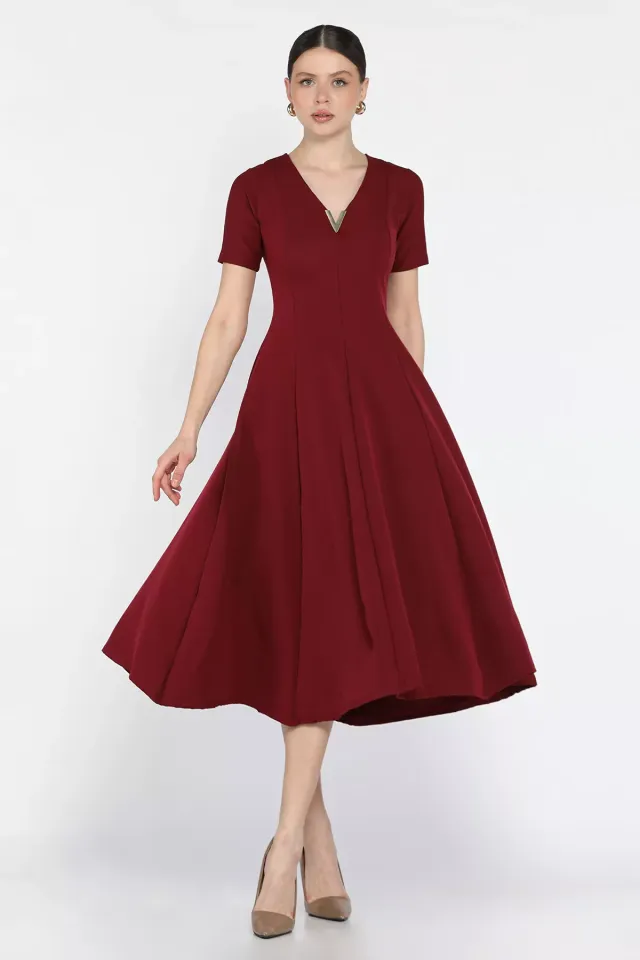 فستان نسائي ميدي كلوش بتصميم كتف مكشوف وحزام مجمع مع نقشة وتفصيل طبقات - Beyond Store