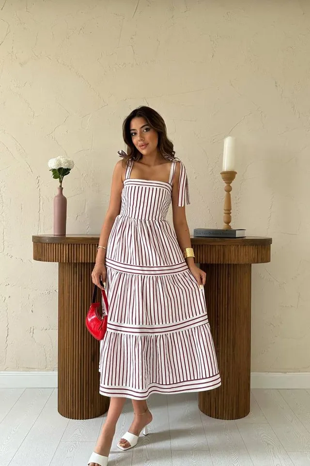 فستان ميدي كلوش بتصميم كتف مكشوف وأكمام بالون قصيرة مع حزام مجمع. يتميز بنقشة وتفصيل طبقات، مناسب للتنسيقات الصيفية الأنيقة والمشاوير اليومية للنساء.