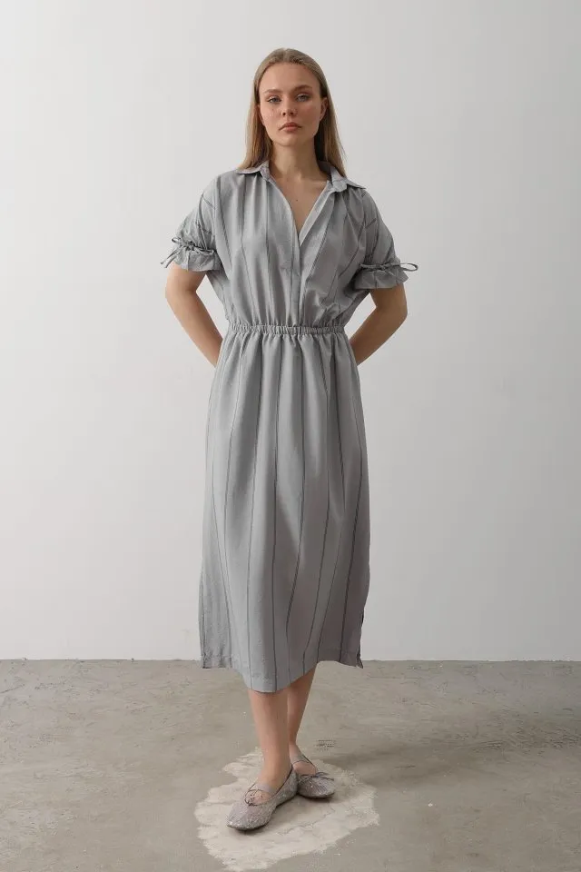 فستان ميدي كلوش بياقة صينية وأكمام طويلة مزين بتطريز زهري. تصميم مريح وخفيف يناسب الإطلالات الصيفية اليومية بإحساس أنيق للنساء.