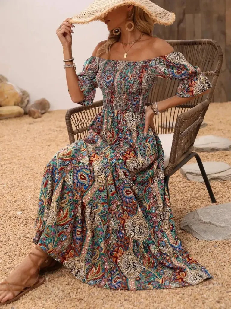 فستان ميدي بقصة A-Line بتصميم متعدد الألوان بياقة ربط وطبقات وأكتاف مفتوحة لإطلالة صيفية جريئة