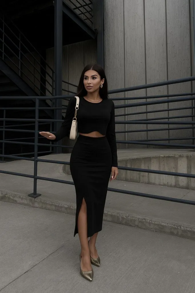 طقم ساتان منقوش، يتكون من بلوزة بأزرار أمامية وتنورة بتفاصيل شق. أنيق وناعم، مثالي للإطلالات الكاجوال أو الأنيقة.