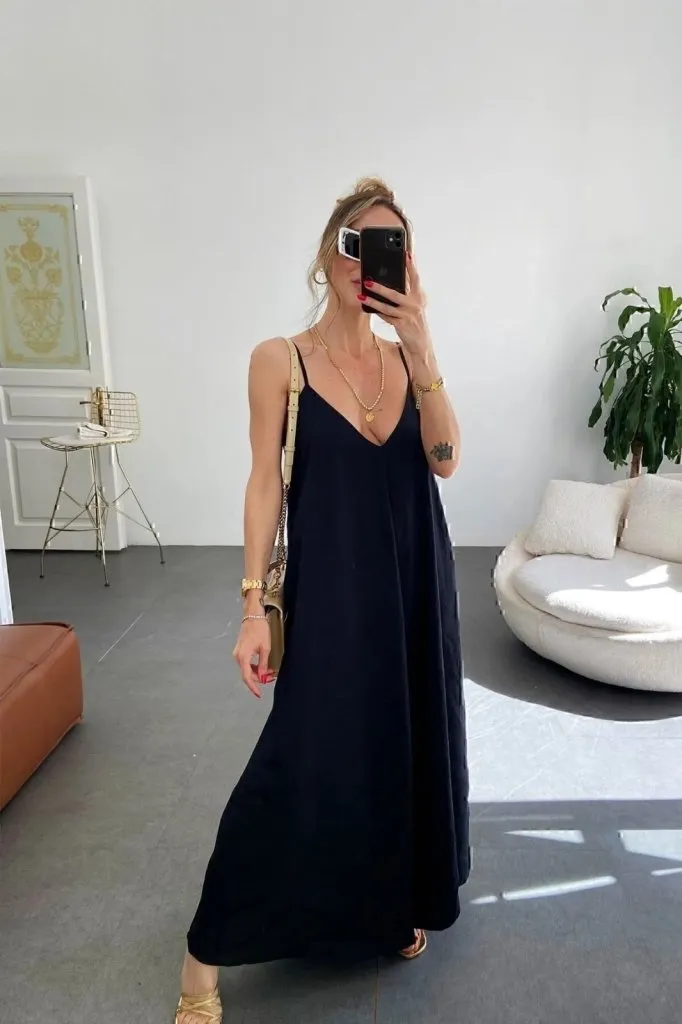 فستان ميدي بنقشة وياقة رسن مع طبقات بدون أكمام. قطعة خفيفة تناسب أيام الصيف والإطلالات اليومية للنساء.