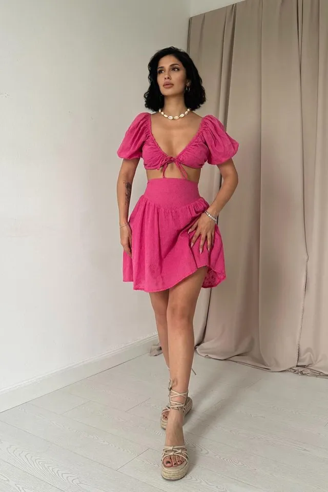 طقم مخطط مكون من بلوزة بأكمام طويلة وتنورة بطيات. أنيق ومريح ومثالي للإطلالات اليومية الكاجوال أو الراقية.