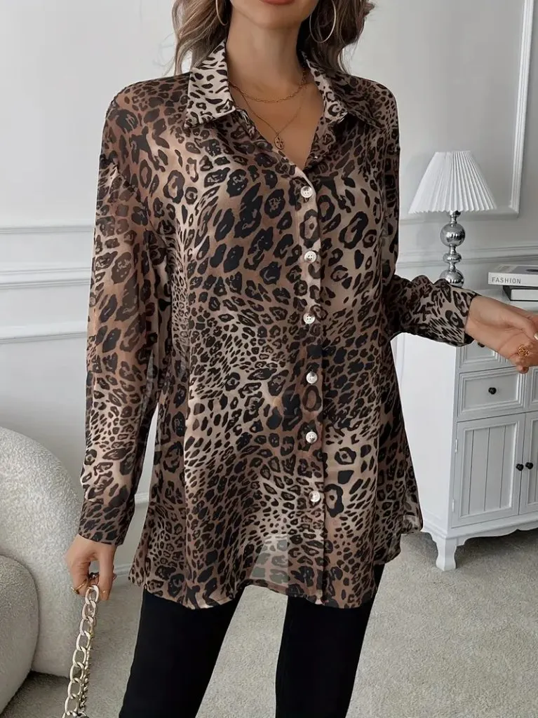 قميص ساتان منقوش بأكمام طويلة للنساء