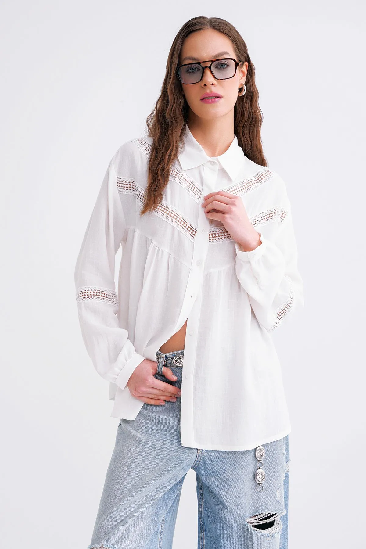 قميص بياقة مربعة مزين بدانتيل مخرم مع أكمام منفوخة وأزرار أمامية. مناسب للتنسيقات الصيفية الكاجوال والإطلالات المرتبة.