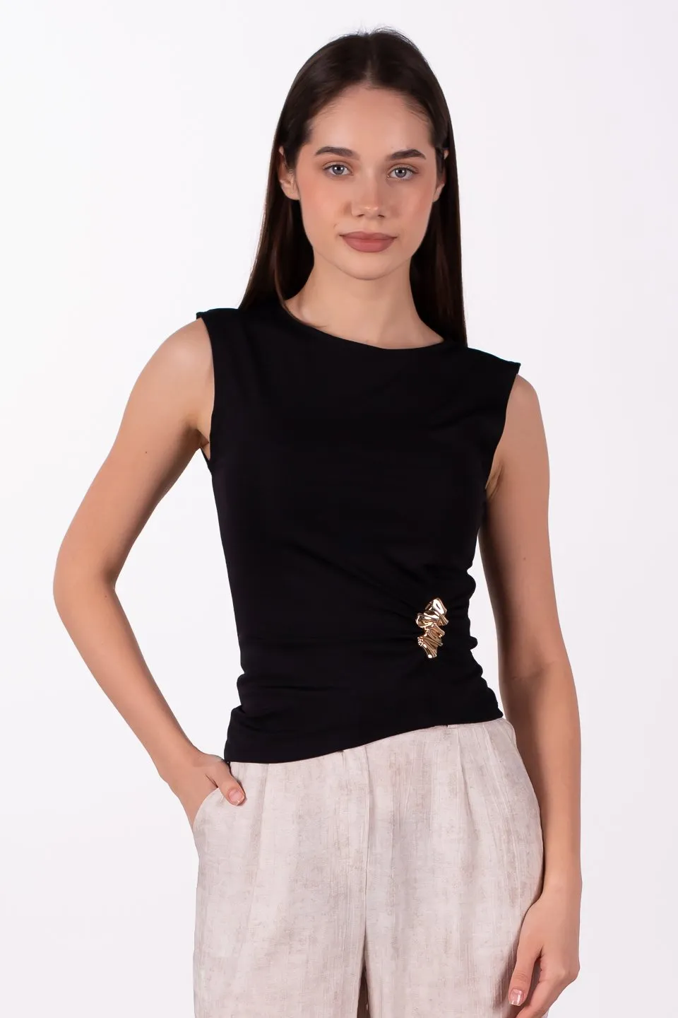 بلوزة بطبعة أمامية مزينة بحجر الراين وتفصيل مجمّع جانبي. تصميم عملي لتنسيقات صيفية خفيفة.