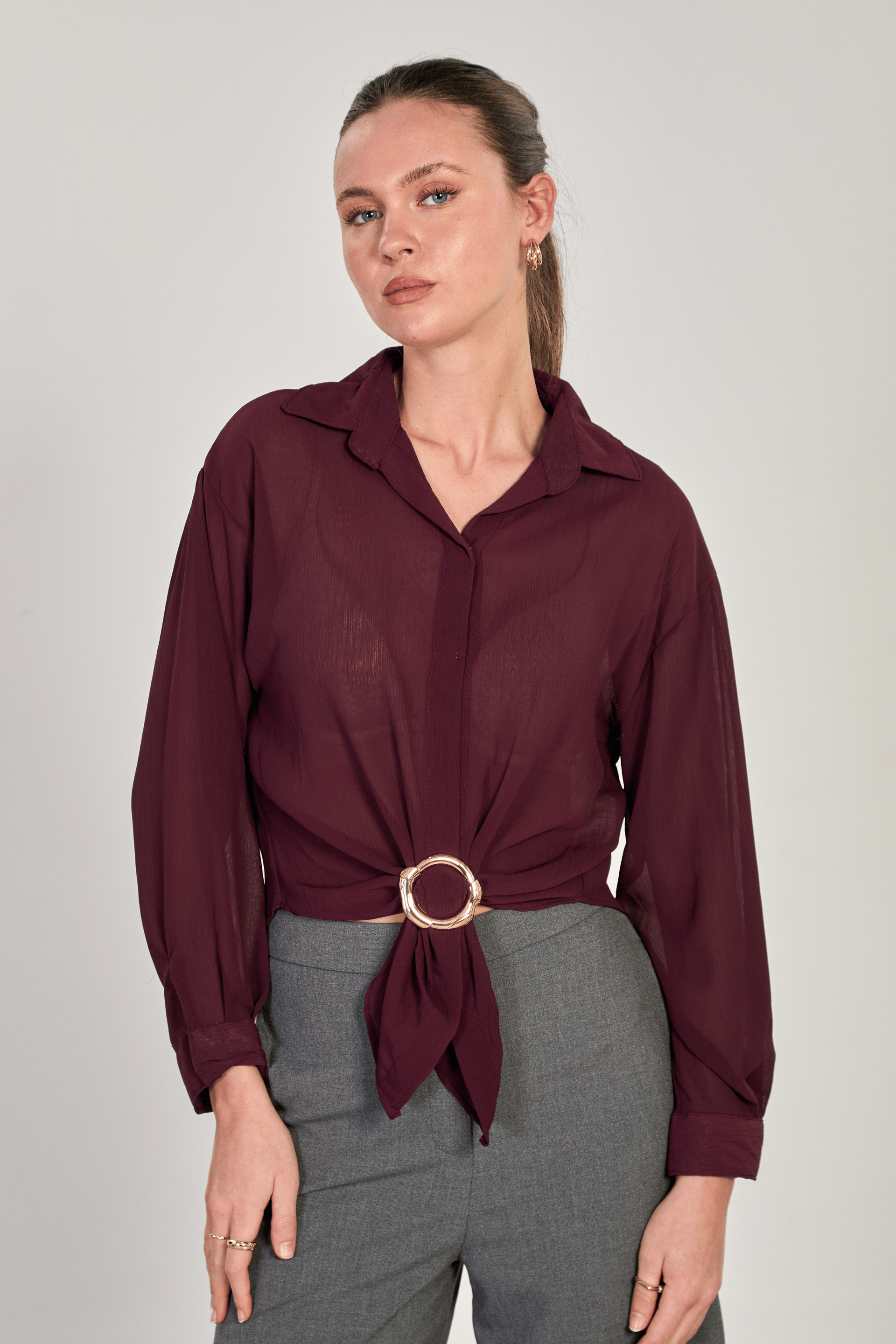 بلوزة مجمعة من الجانبين مع تطريز ناعم وياقة دائرية بقصة محددة. قطعة متعددة الاستخدام لتنسيقات يومية وخفيفة.