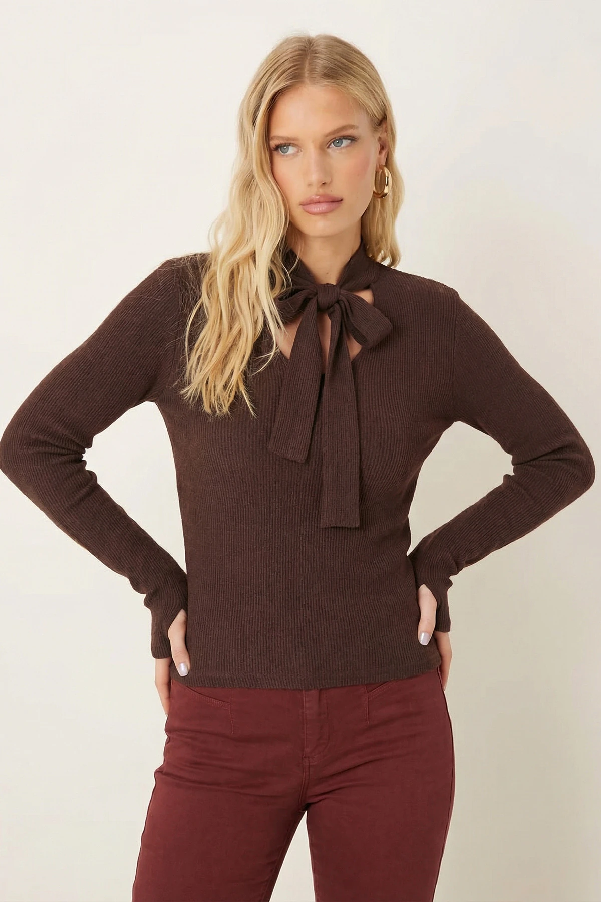 بلوزة نسائية محبوكة بقصة محددة ونقشة مخرمة مع ياقة دائرية وأكمام طويلة. طبقة أنيقة ومريحة لأيام الصيف.