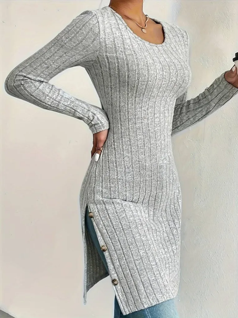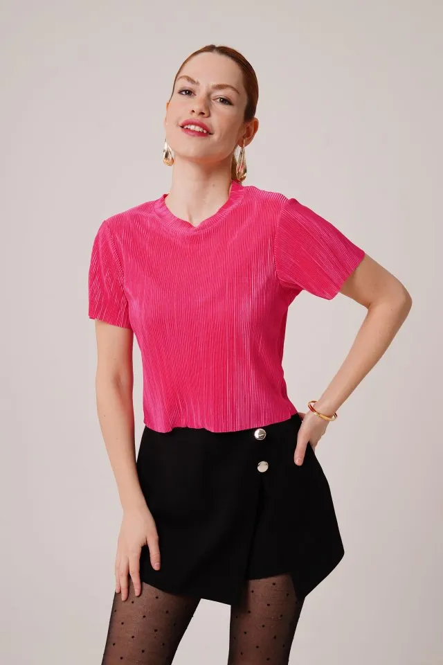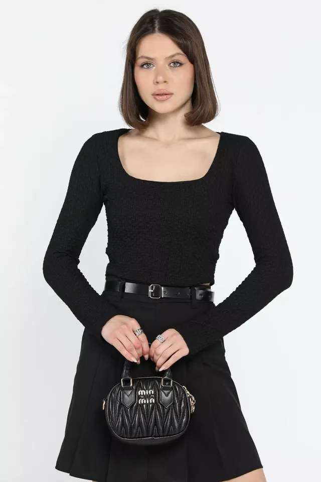 بلوزة نسائية بتفاصيل درابية على الخصر والكتف مع أكمام طويلة وياقة دائرية. قصة بارزة لإطلالات يومية أنيقة وواثقة.