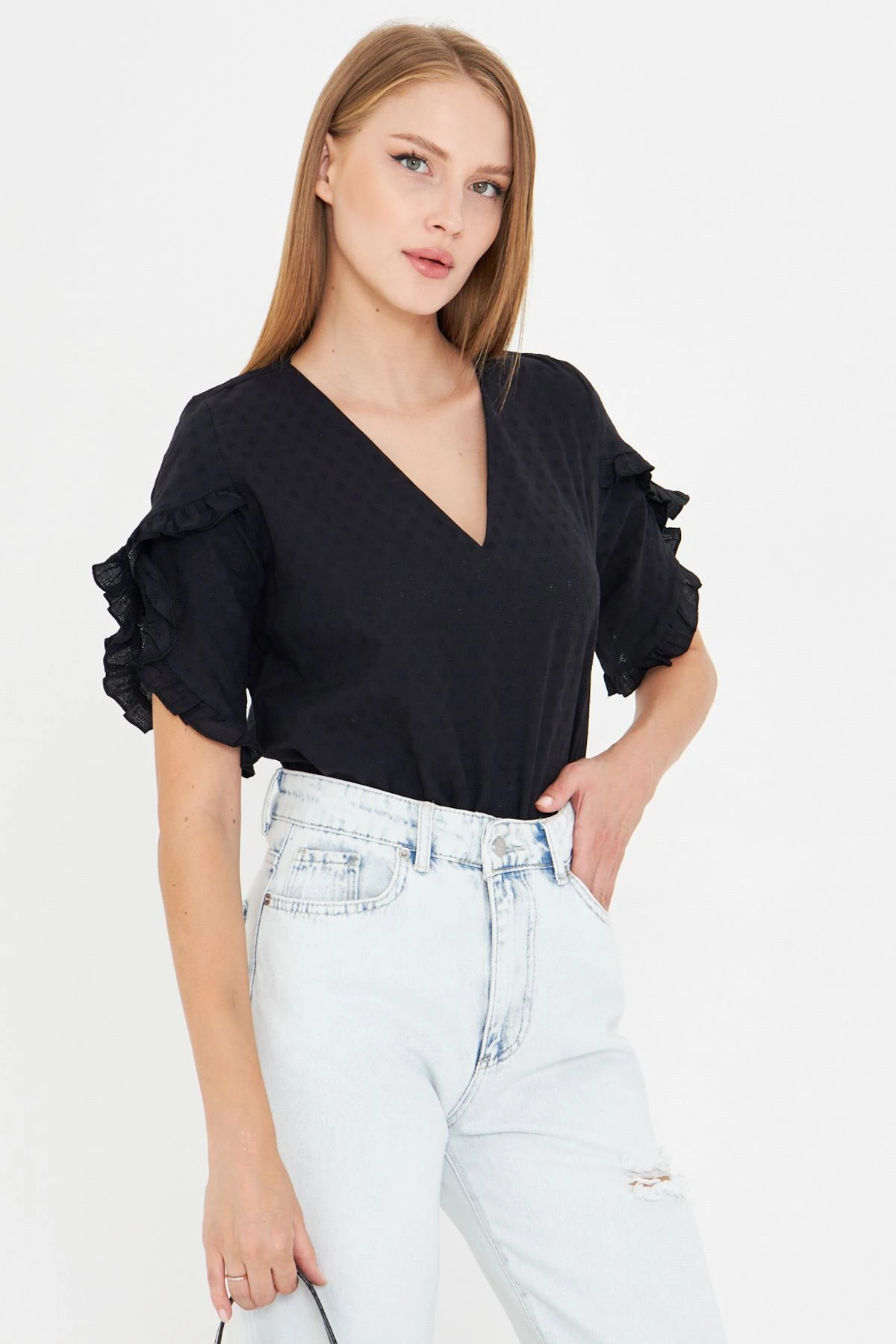 بلوزة نسائية بتفاصيل درابية على الخصر والكتف وأكمام طويلة