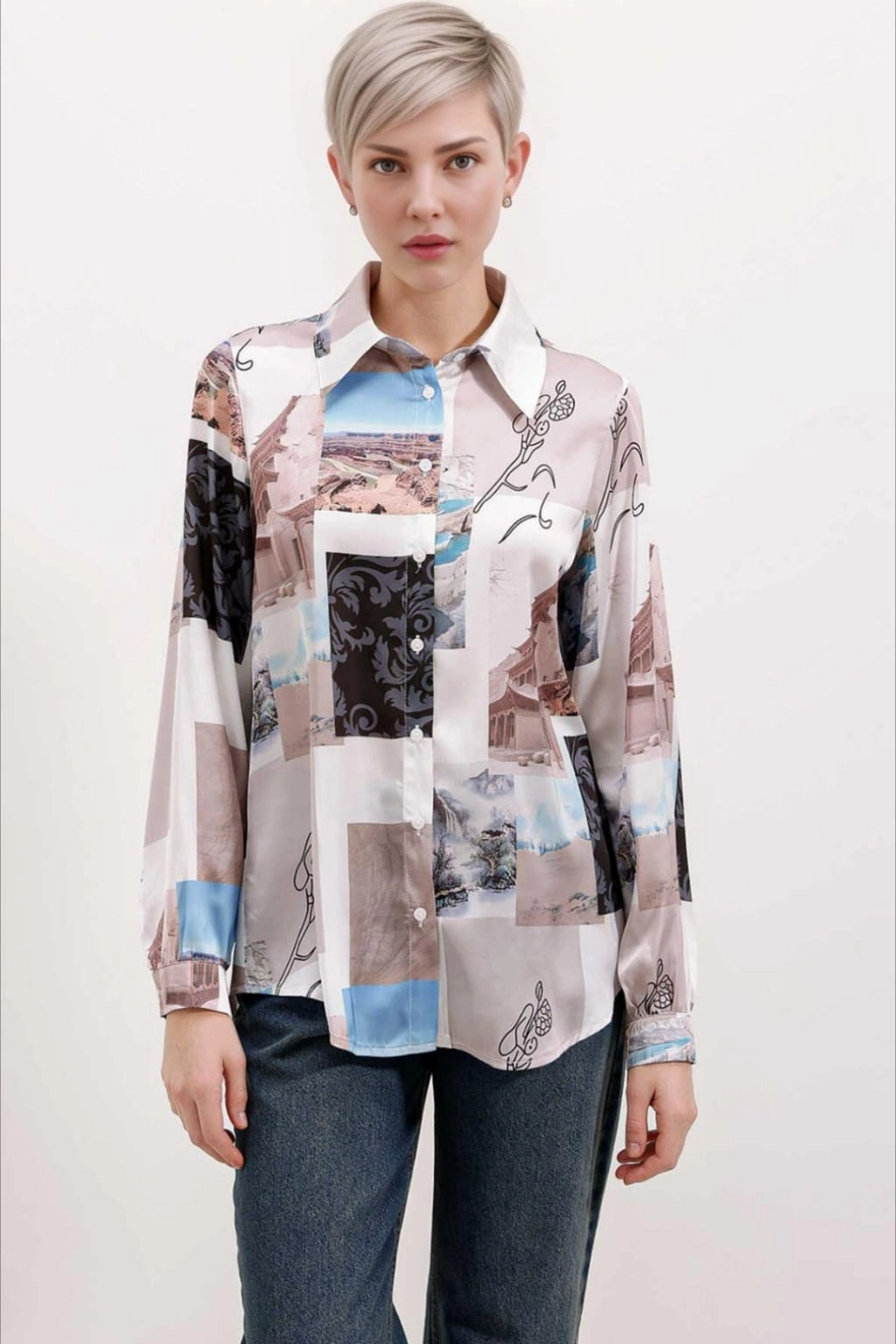 قميص مخطط بأكمام طويلة وياقة صينية مع أزرار أمامية. خامة خفيفة ومريحة للتنسيق اليومي والتنقل بسلاسة.