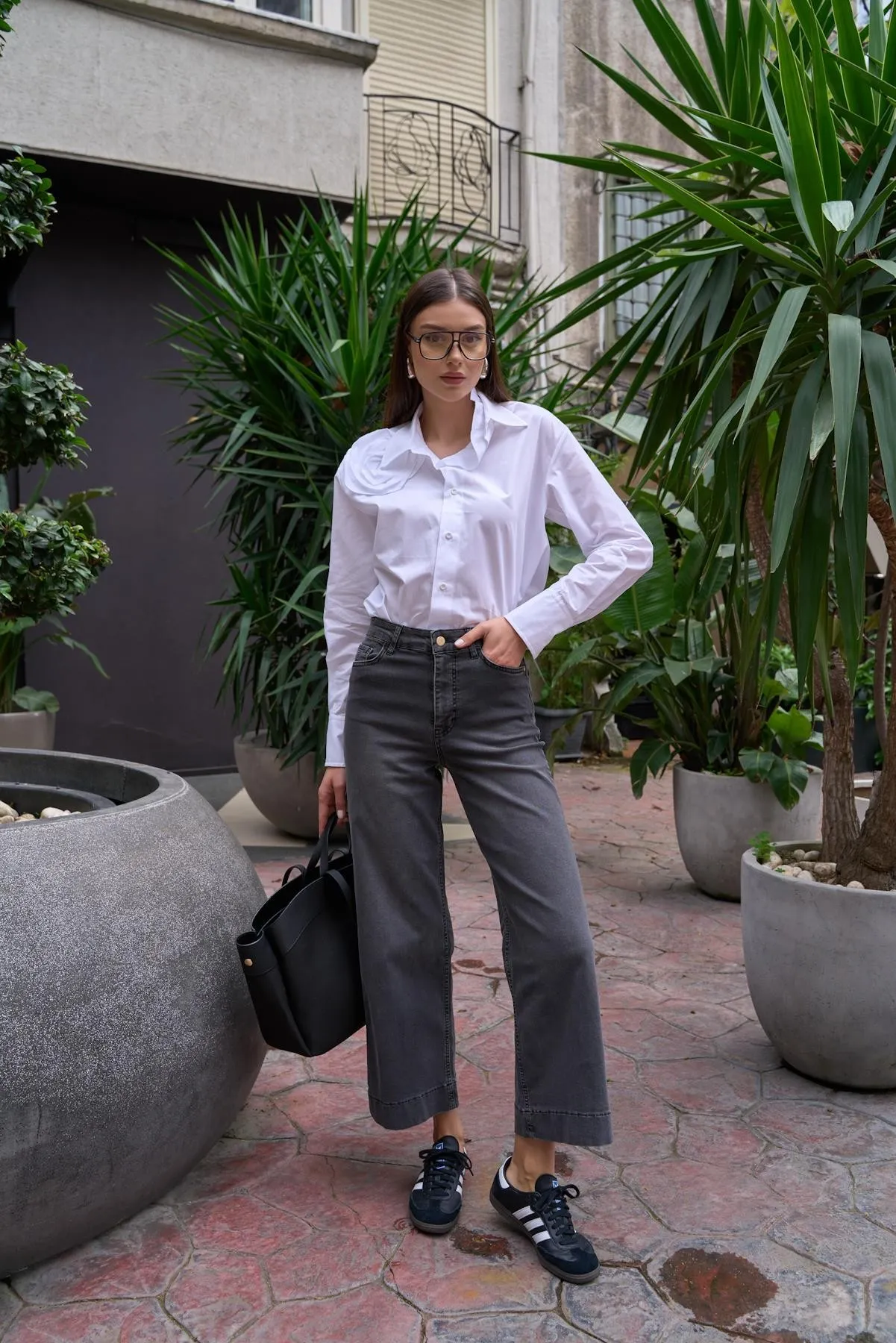 قميص بأكمام طويلة وتفصيل فيونكة وقصة كتف منخفض مع أزرار أمامية. مناسب لأناقة صباحات العيد وتنسيقات المواسم.