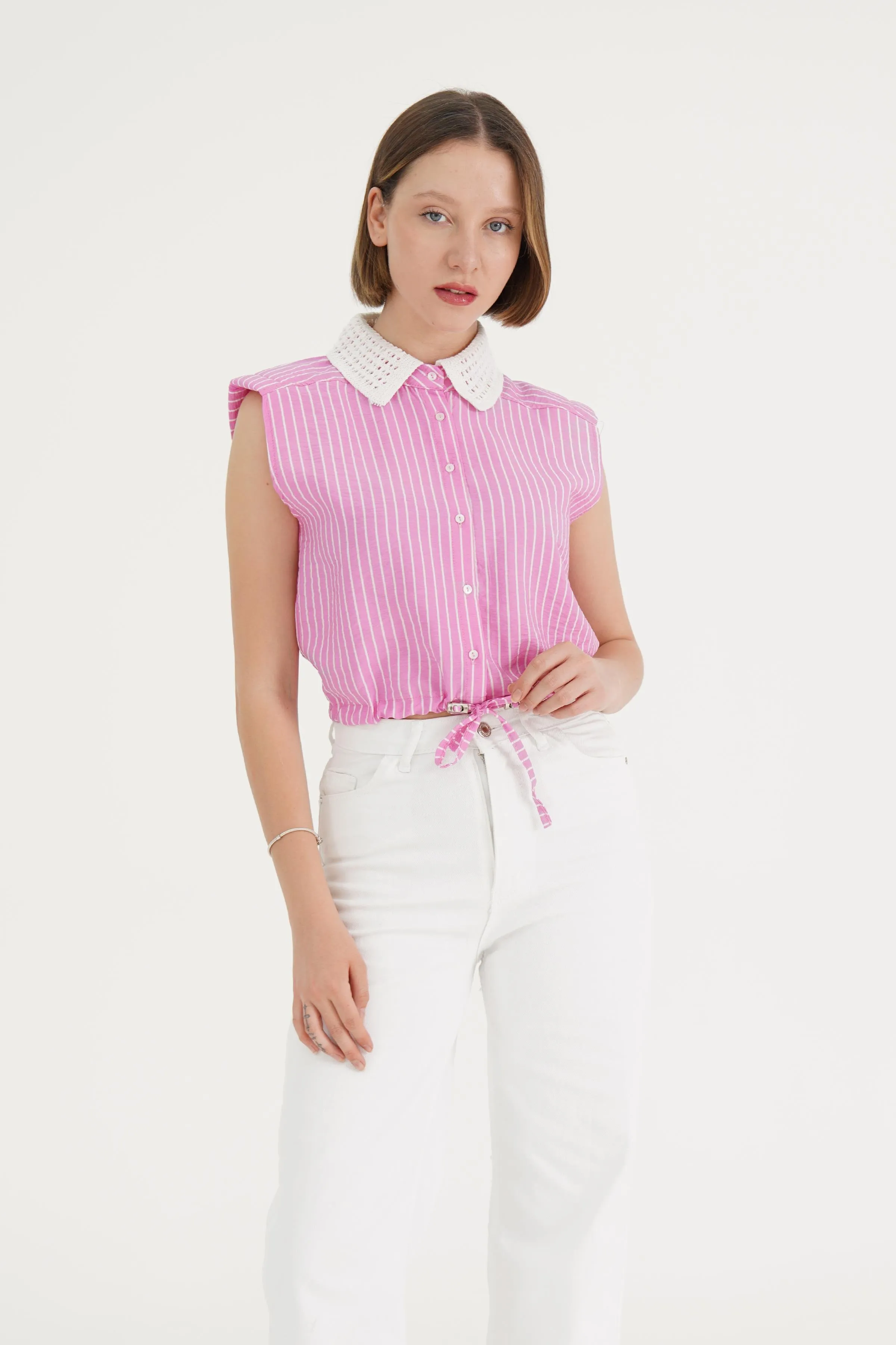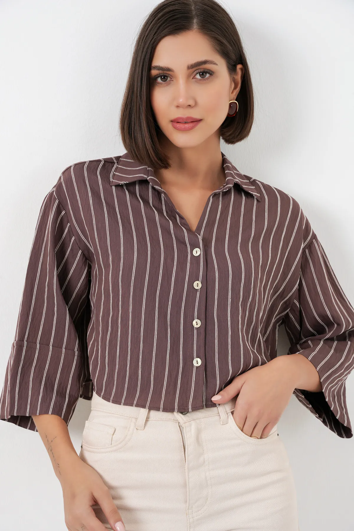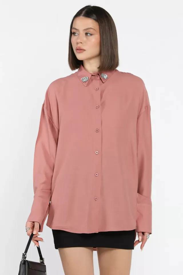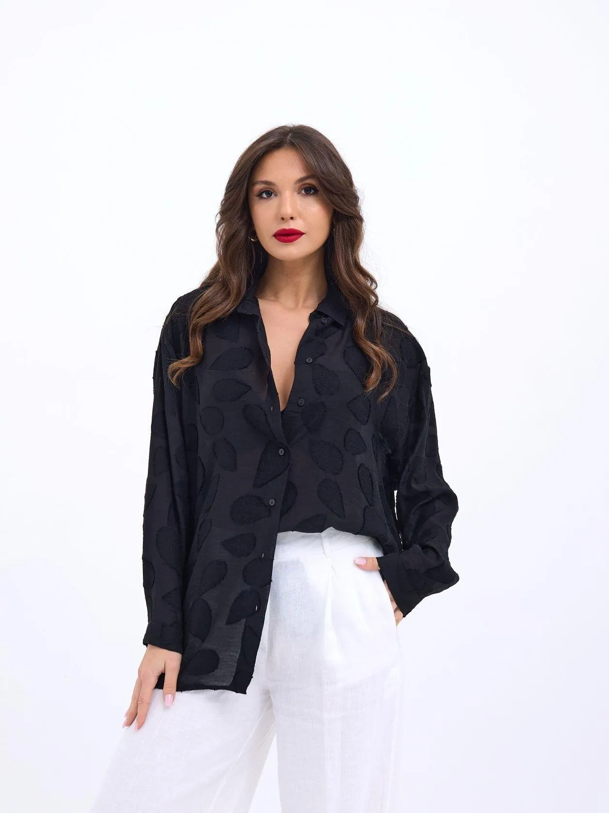 قميص نسائي بأكمام طويلة من قماش موسلين مجعد، بجيب أمامي وقصة واسعة. خفيف، يسمح بمرور الهواء، ومثالي للارتداء الكاجوال.
