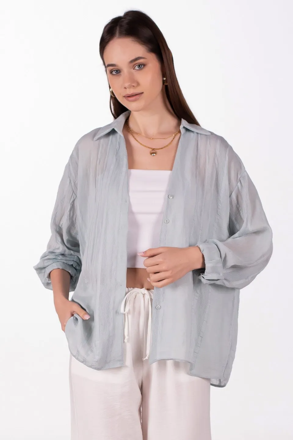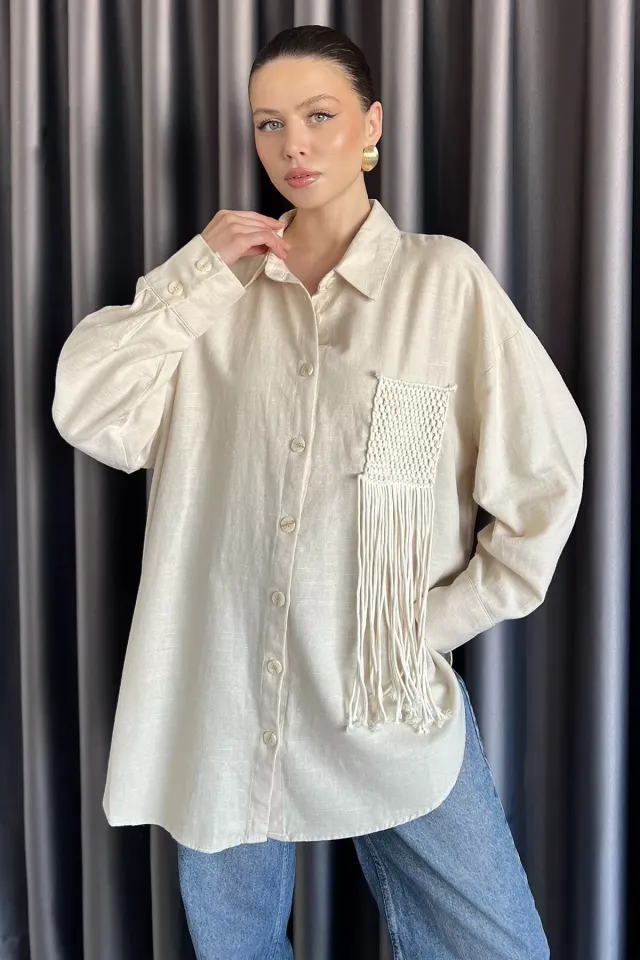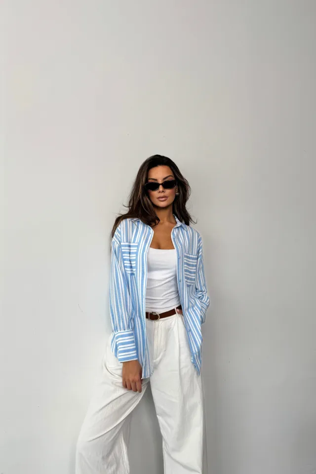 قميص نسائي مخطط بأكمام طويلة وجيبين مزدوجين. مثالي للارتداء غير الرسمي.