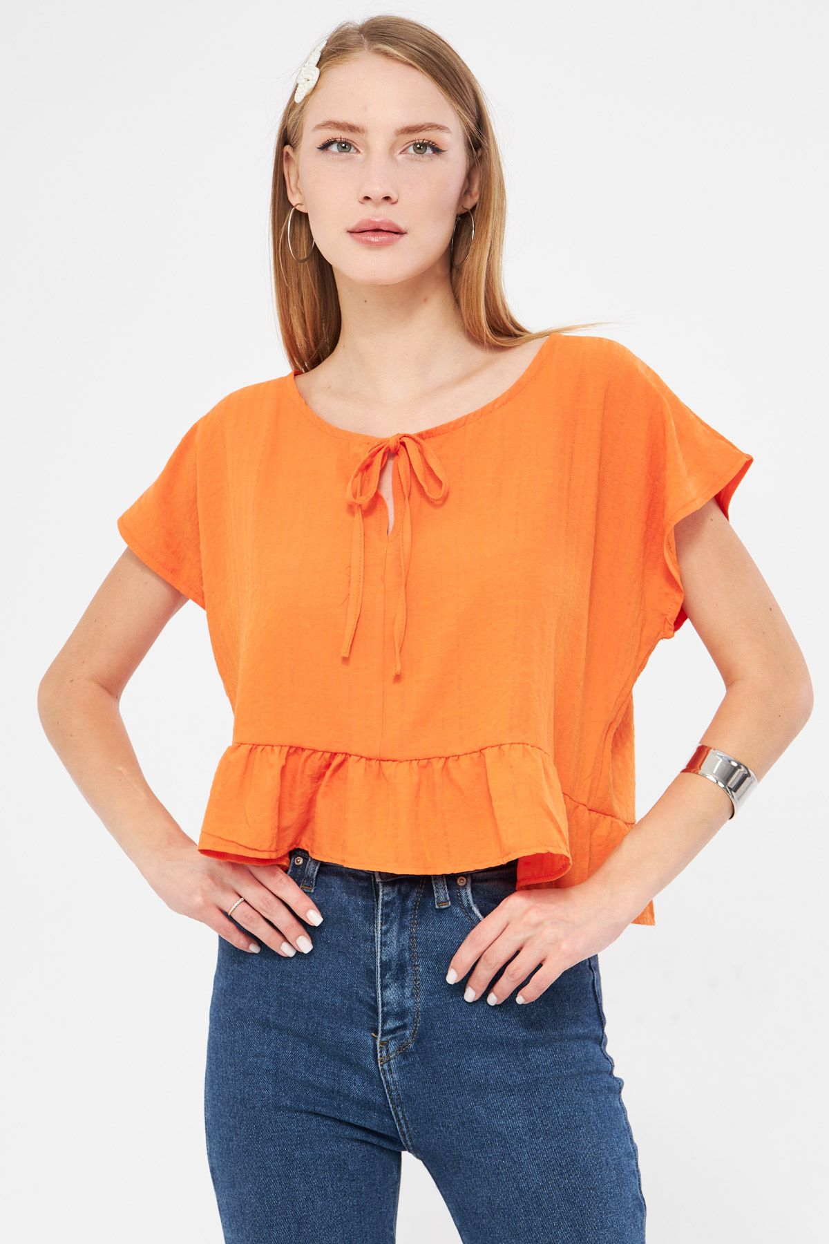 بلوزة مزهرة بأكمام منتفخة وحافة كشكش وياقة دائرية مع طيات ناعمة. مثالية للإطلالات الخفيفة في الأيام المشمسة.