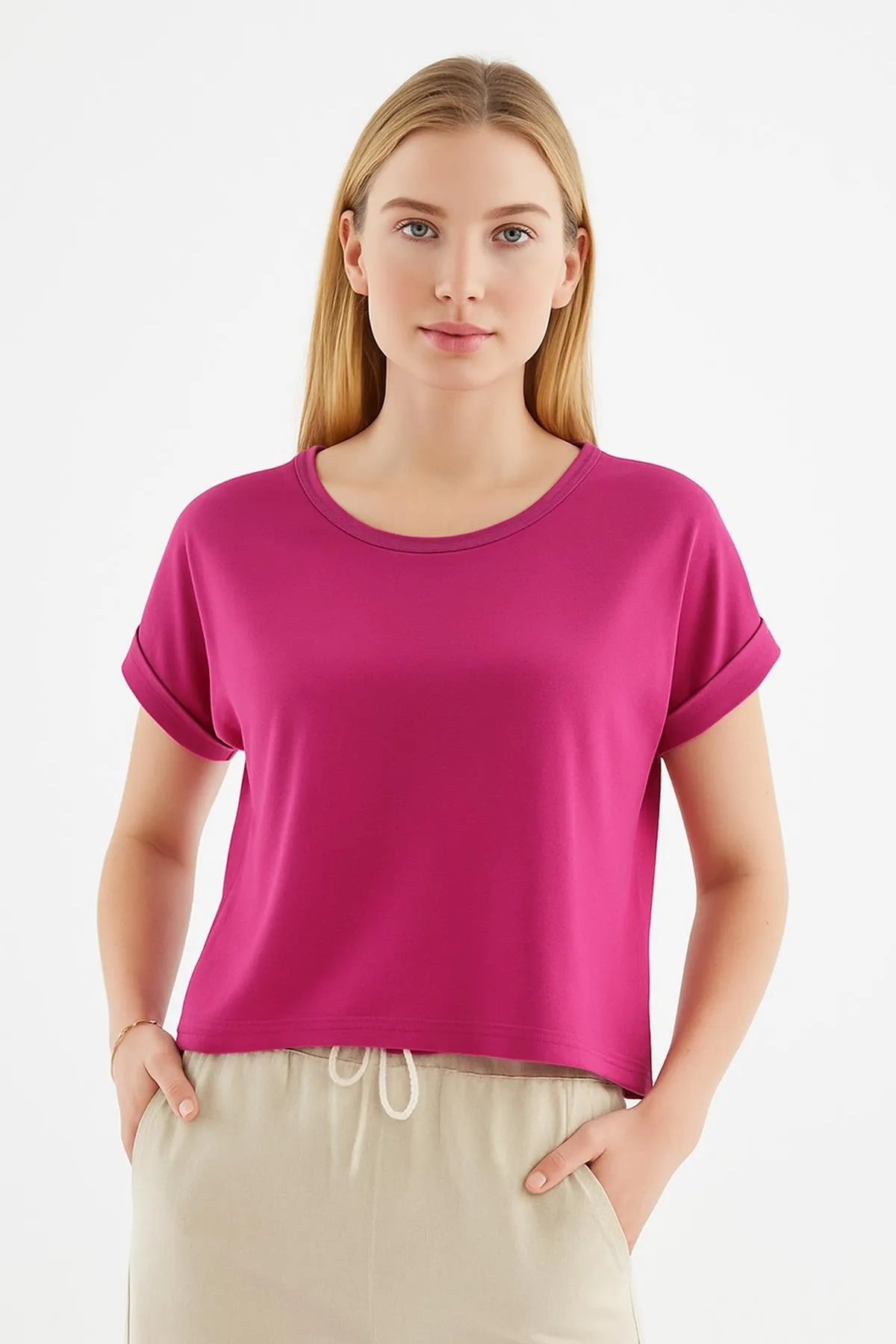 بلوزة مزهرة بأكمام منتفخة وحافة كشكش وياقة دائرية مع طيات ناعمة. مثالية للإطلالات الخفيفة في الأيام المشمسة.