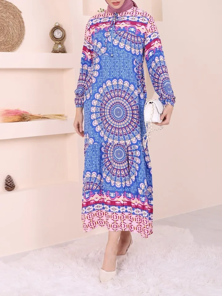 فستان ماكسي غير مبطن بقماش فيسكوز 100٪ بنقشة تراثية وأزرار أمامية، يمنحك إحساسًا مريحًا وأناقة محتشمة مثالية للأيام الدافئة أو تنسيقه بإكسسوارات ناعمة لإطلالة متجددة.