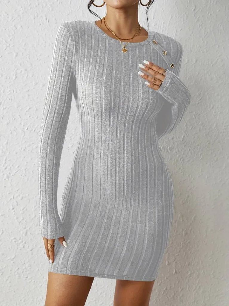فستان تريكو بياقة U عميقة وتفاصيل مخرمة، خيار ناعم وأنيق لإطلالات العيد.