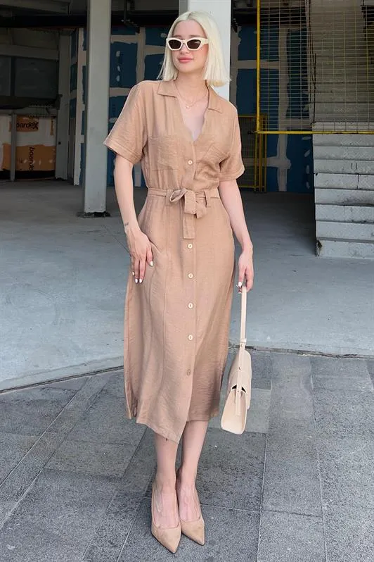 فستان نسائي ميدي من الكتان بياقة دائرية وقصة A بدون أكمام