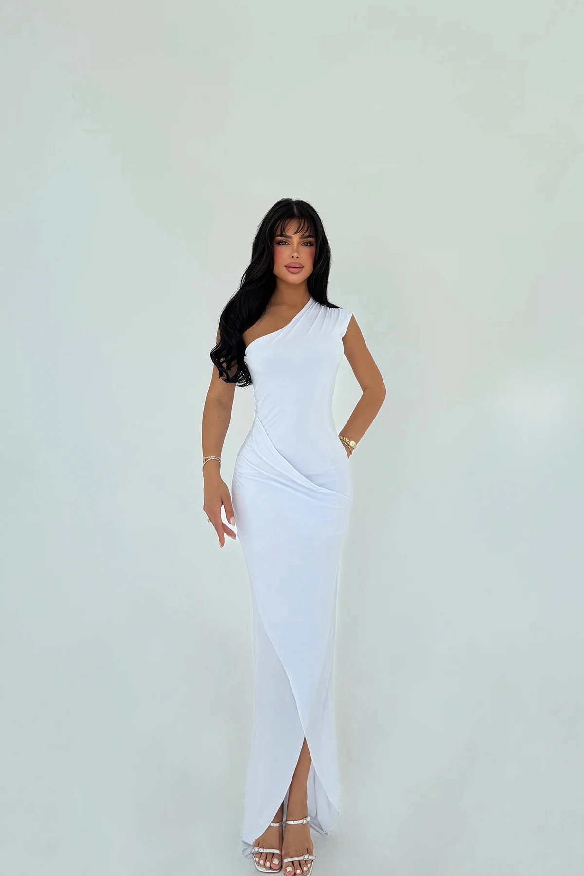 فستان ميدي بحمالات عريضة وتفصيل حزام مع صدر مزدوج، قطعة مسائية بتصميم منسق يبرز القوام ويمنحك أناقة واثقة.