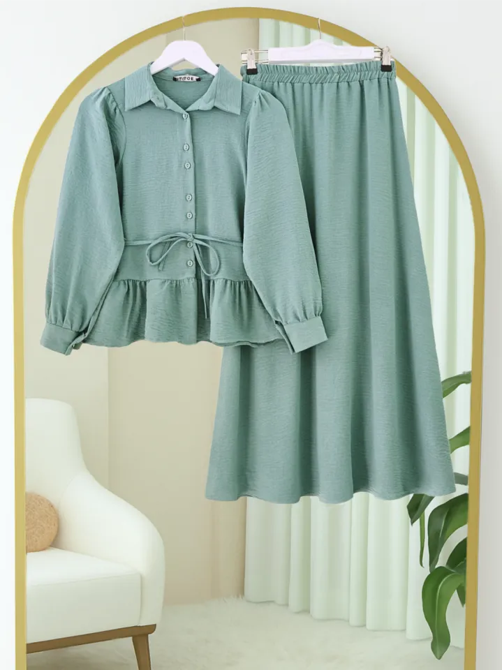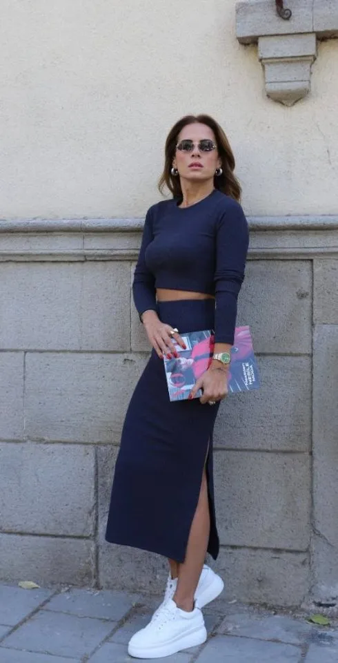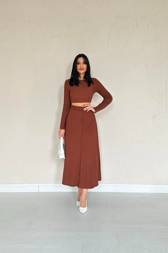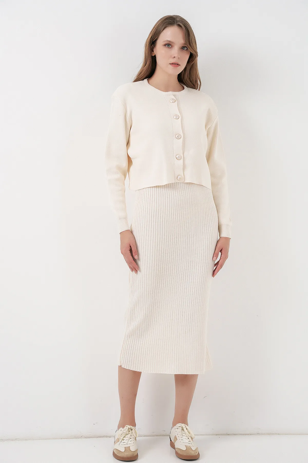 استمتعي براحة يومية مع طقم نسائي محبوك من قطعتين بتصميم أوف شولدر وتنورة ميدي بقصة A وخصر عالي، مثالي لإطلالات الصيف العملية.
