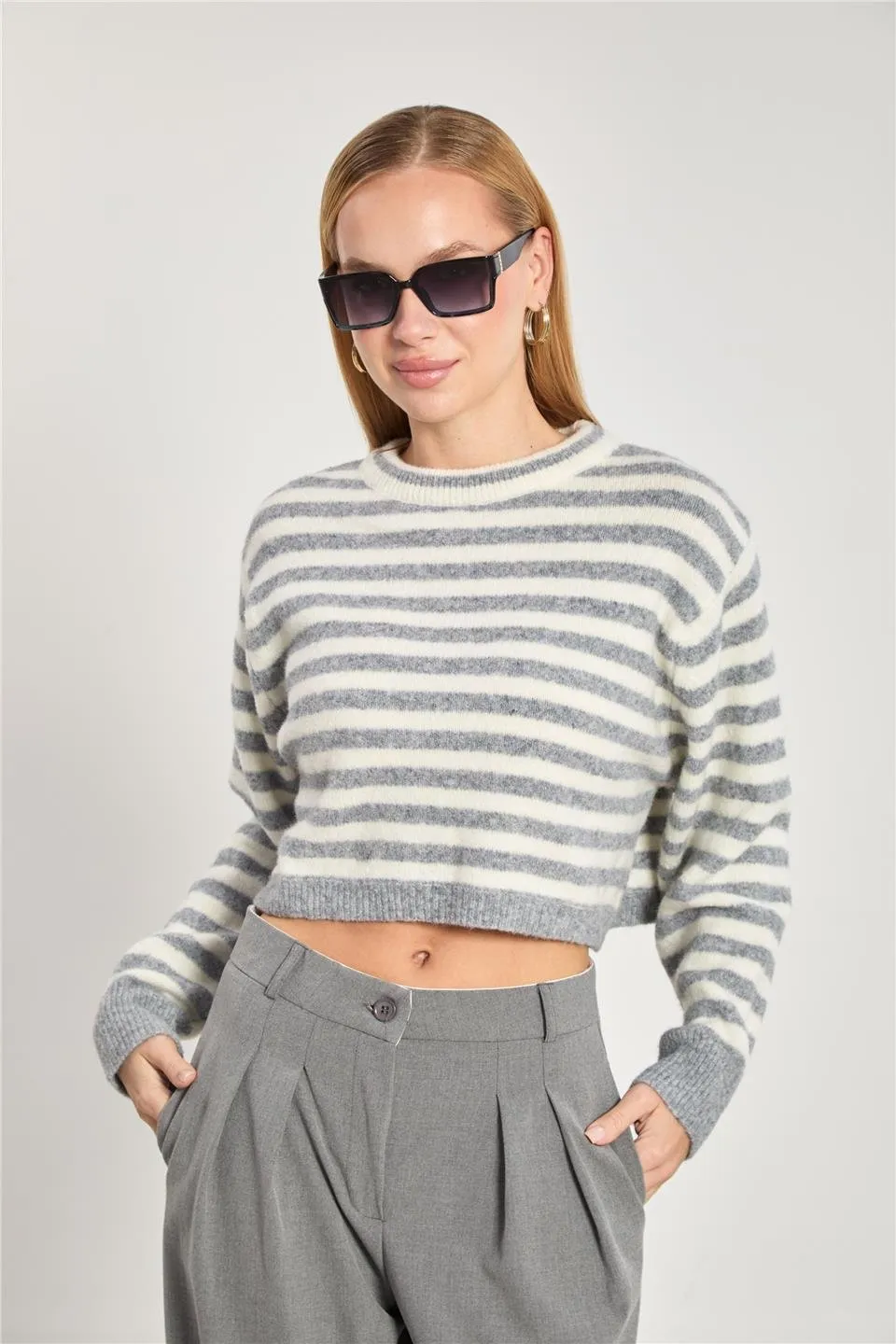 كنزة تريكو قصيرة محاكة بملمس ناعم وياقة دائرية للنساء