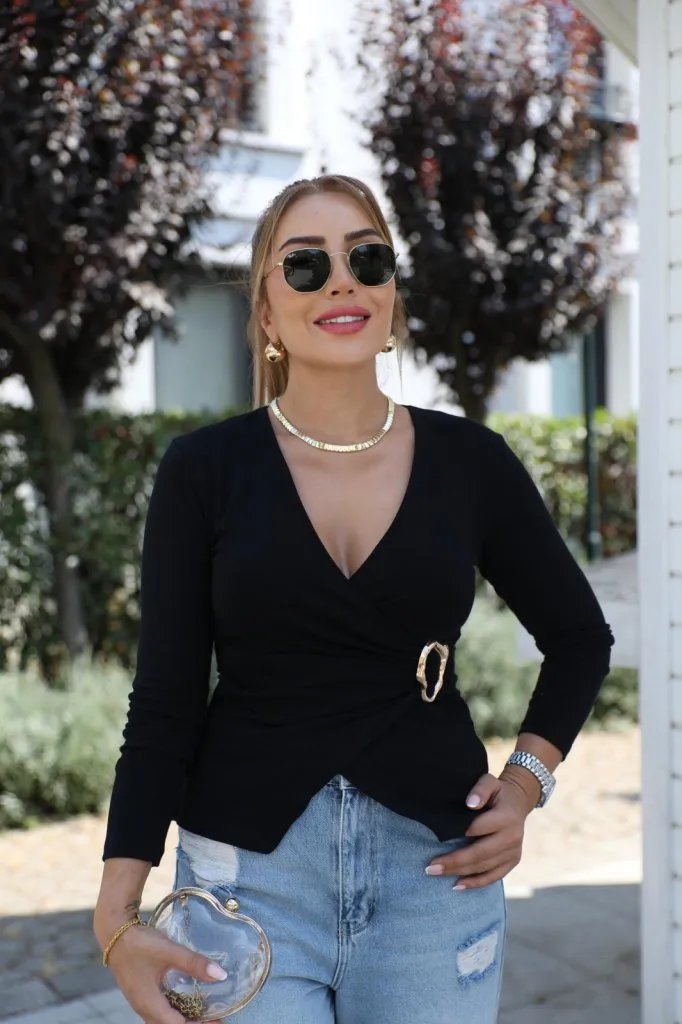 بلوزة بتفاصيل متقاطعة وأكمام طويلة مع كسرات ناعمة، مصنوعة من مزيج فيسكوز مطاطي يمنح راحة وأناقة للنساء.