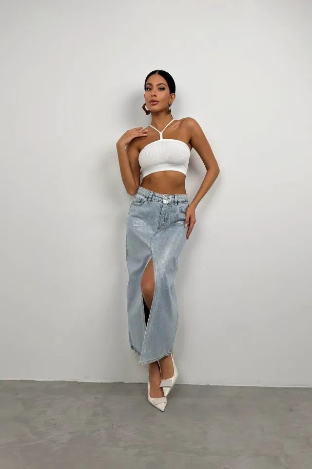 توب كروب جينز بتصميم مثلث مع ربط عند العنق والظهر، قطعة جريئة وضاغطة مع تفاصيل خياطة متناقضة، مثالية لتنسيقات العيد والصيف.