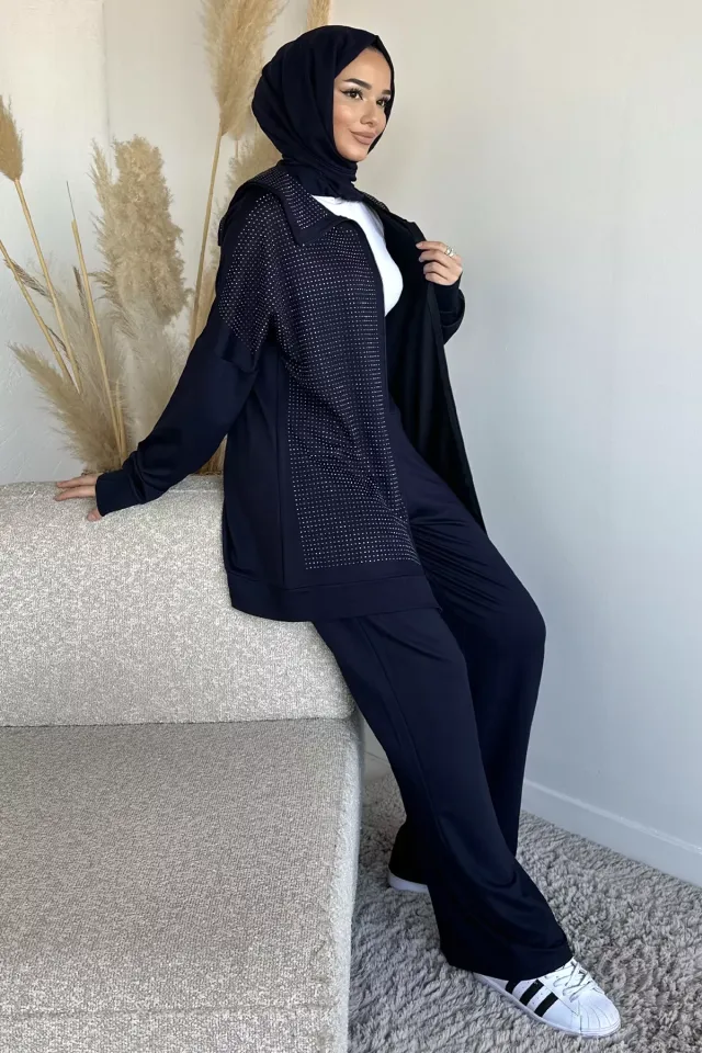 طقم بنطلون صيفي مكون من قطعتين برقبة دائرية وتونيك مزين بتفاصيل حجرية أمامية، تصميم محتشم يوفر أناقة وراحة مثالية لأيام العطلات الدافئة.