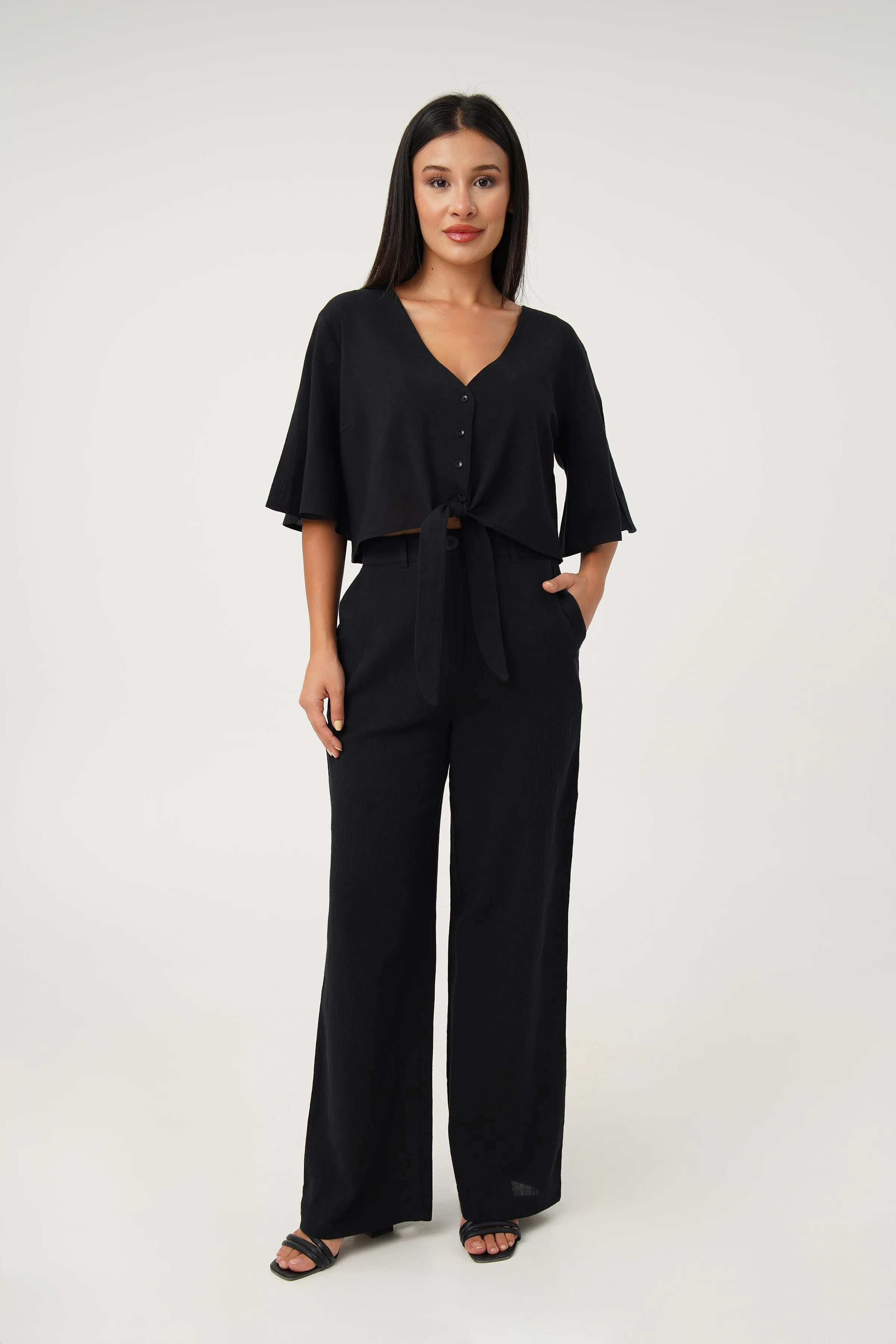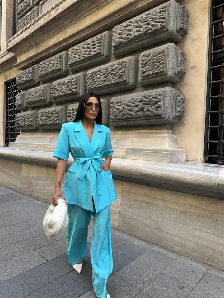 طقم من قطعتين يضم بلوزة بحمالات رفيعة وبنطلون بخصر مطاطي، تصميم خفيف ومريح مثالي لأيام الصيف والإطلالات الكاجوال البسيطة.