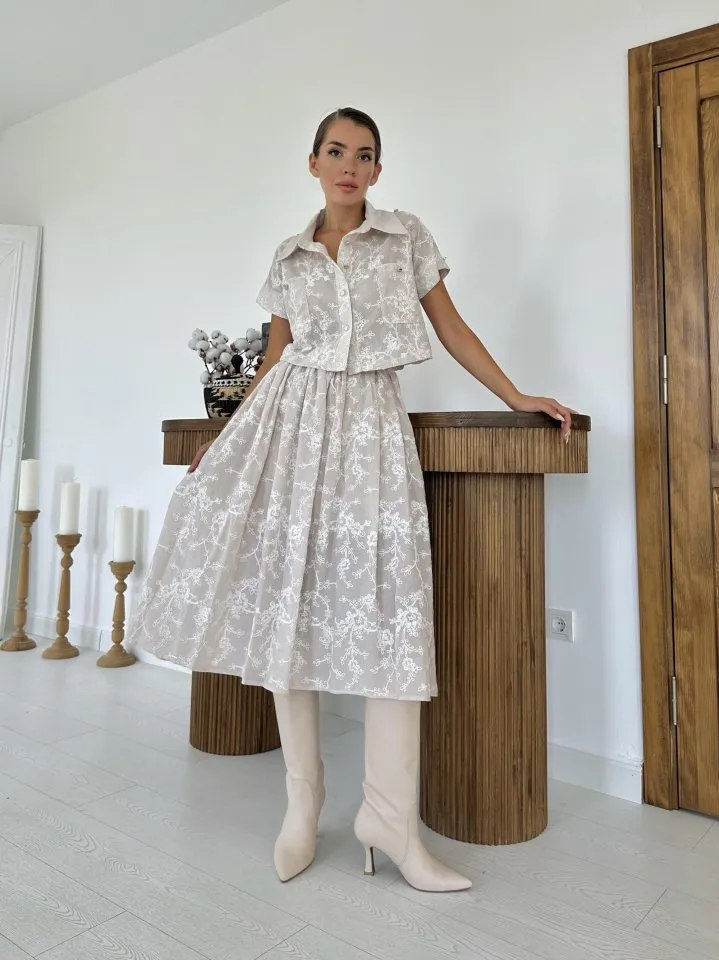 طقم نسائي من قطعتين بلوزة وتنورة من الكتان المطرز - Beyond Store