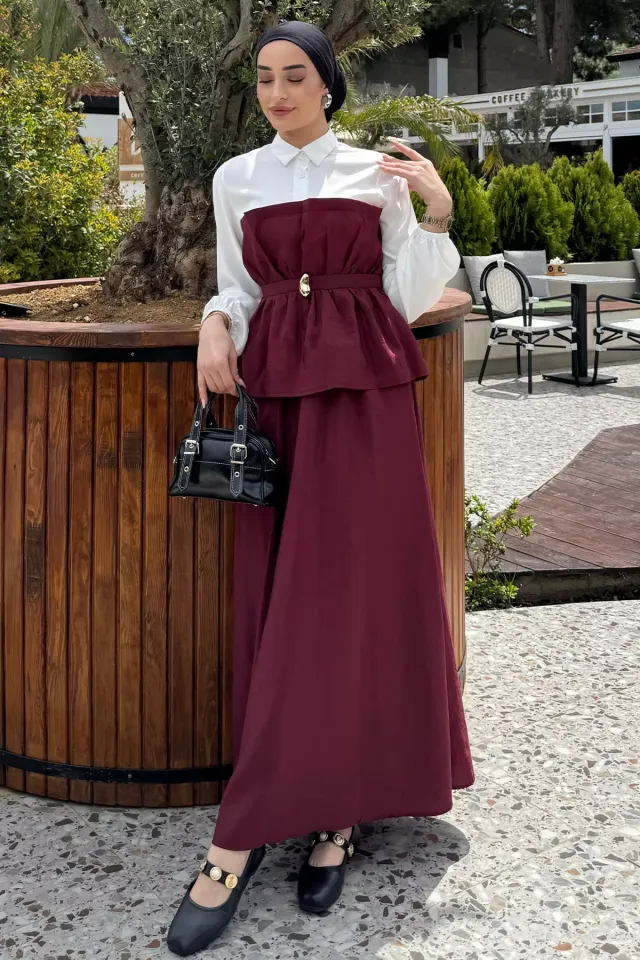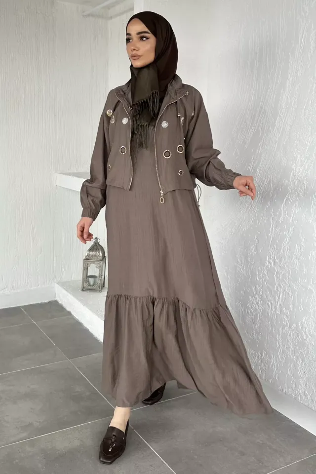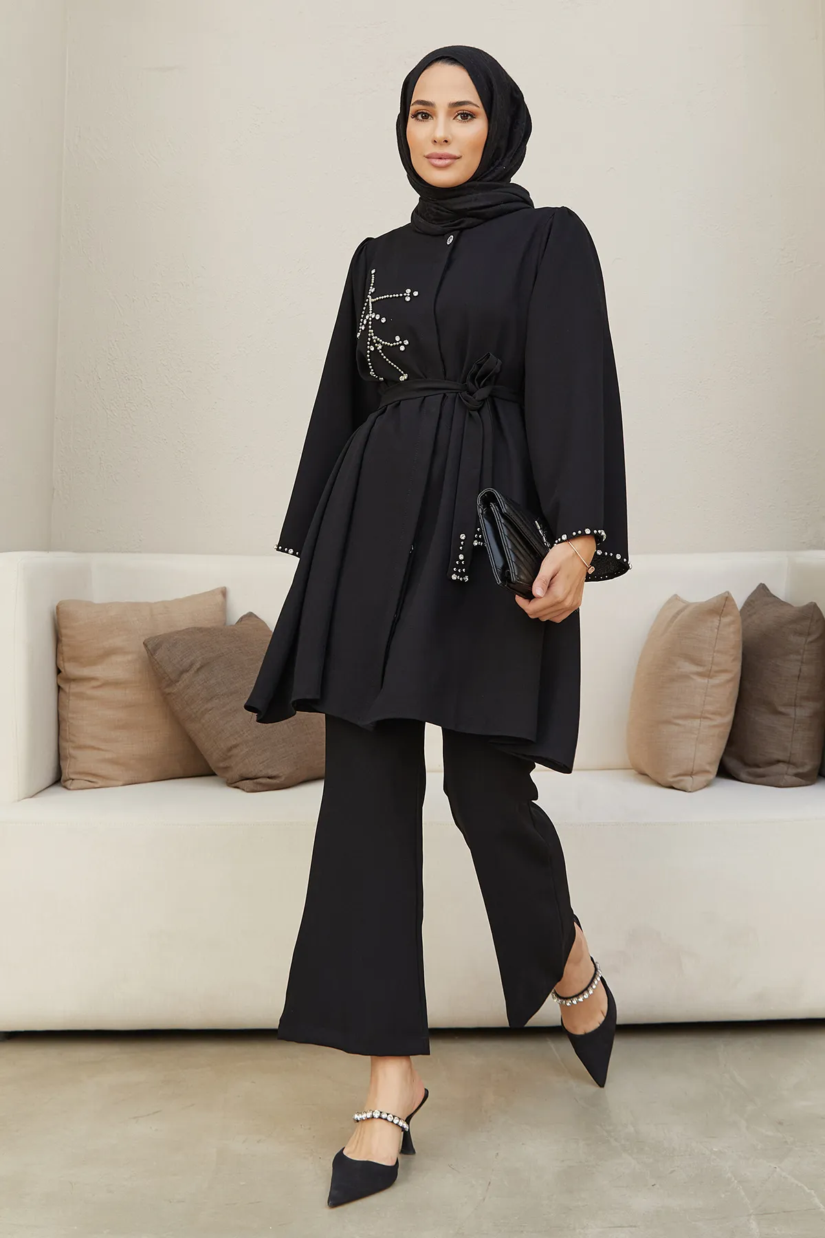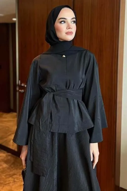 طقم بنطلون أنيق مكون من قطعتين بتونيك بأكمام طويلة وياقة قميص وتفاصيل حجر ناعمة وساق واسعة، تصميم محتشم يوفر راحة وأناقة مع حركة سلسة تناسب احتفالات العيد والمناسبات الخاصة.