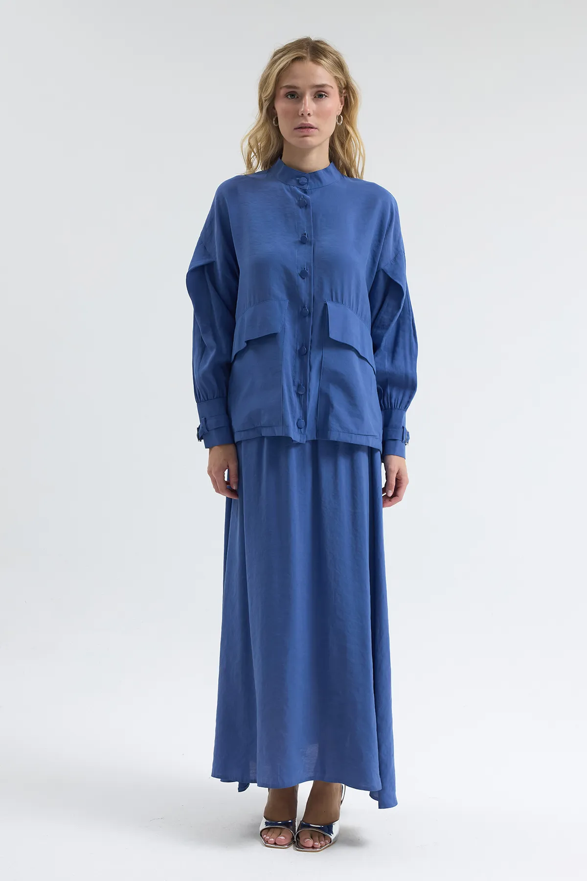 طقم فيست أنيقة مكون من قطعتين برقبة قميص وبنطلون، تصميم محتشم يجمع بين الأناقة والبساطة، مثالي لتجمعات العيد والمناسبات الخاصة.
