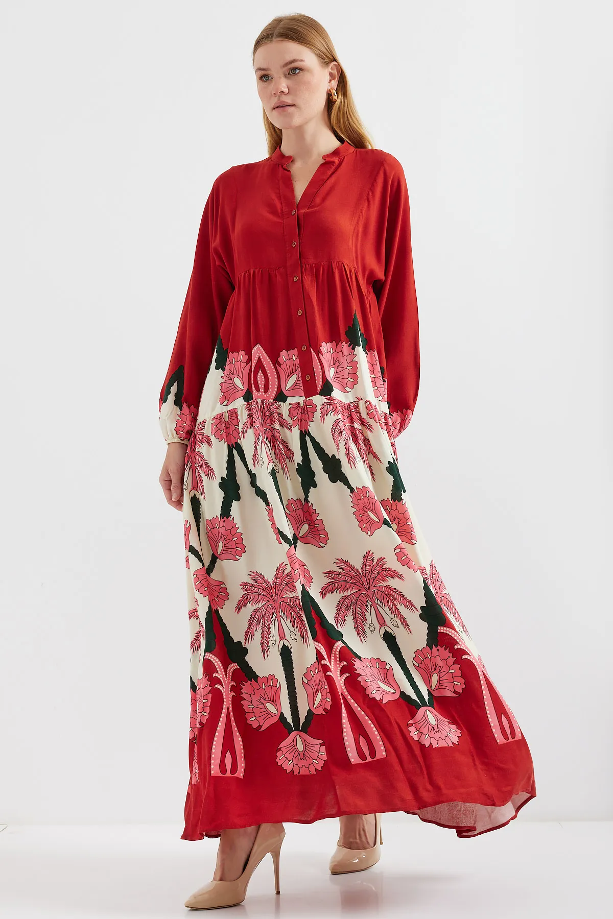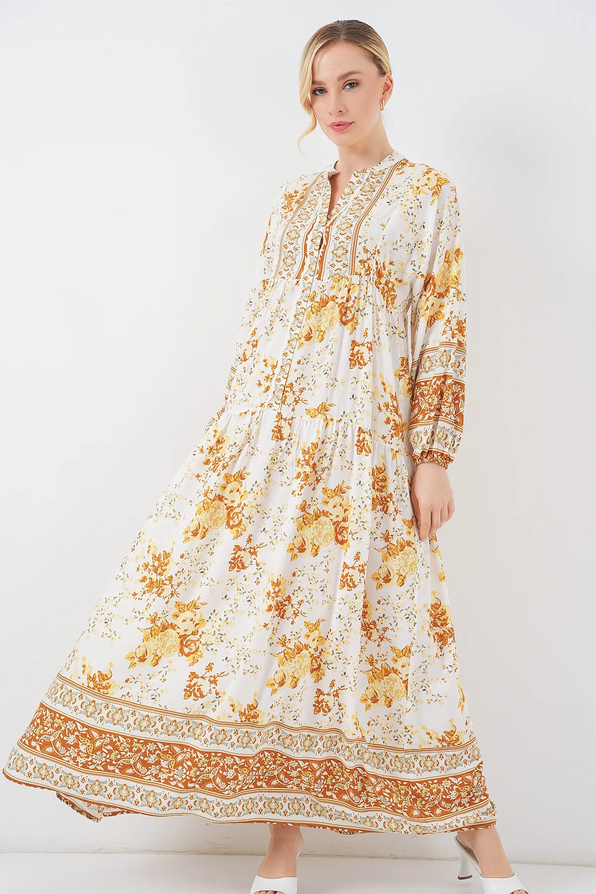 فستان ماكسي غير مبطن بقماش فيسكوز 100٪ بنقشة تراثية وأزرار أمامية، يمنحك إحساسًا مريحًا وأناقة محتشمة مثالية للأيام الدافئة أو تنسيقه بإكسسوارات ناعمة لإطلالة متجددة.