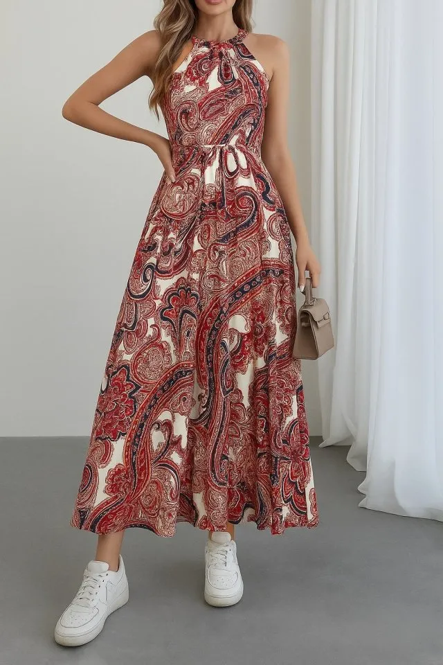فستان ماكسي بلونين متناسقين بياقة V وحمالات رفيعة وقصة غير متماثلة، قطعة صيفية مفعمة بالحيوية بقصة A منسدلة.